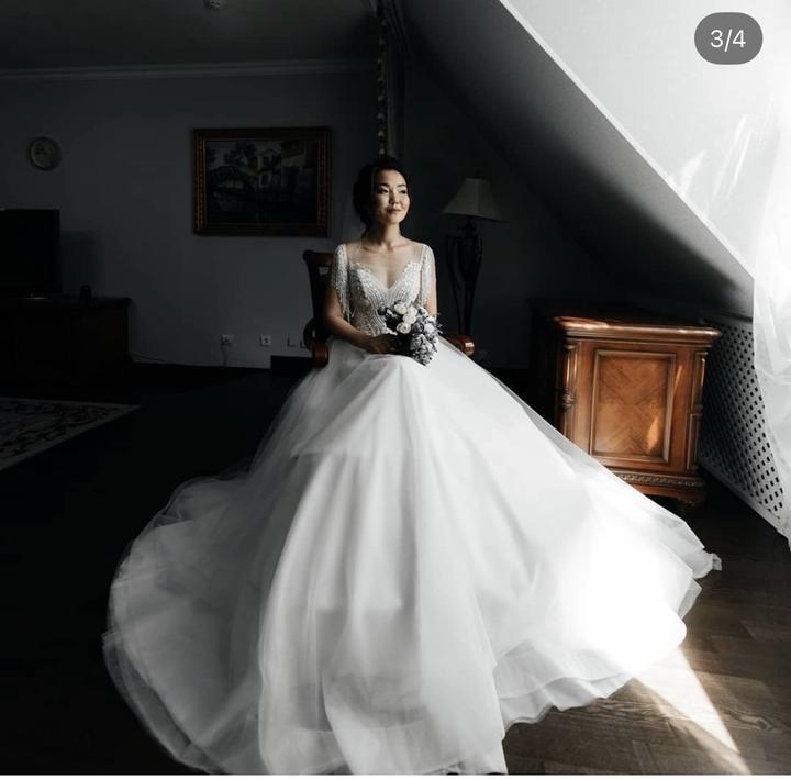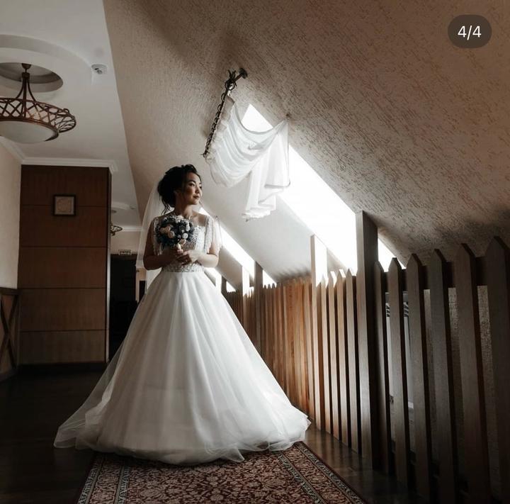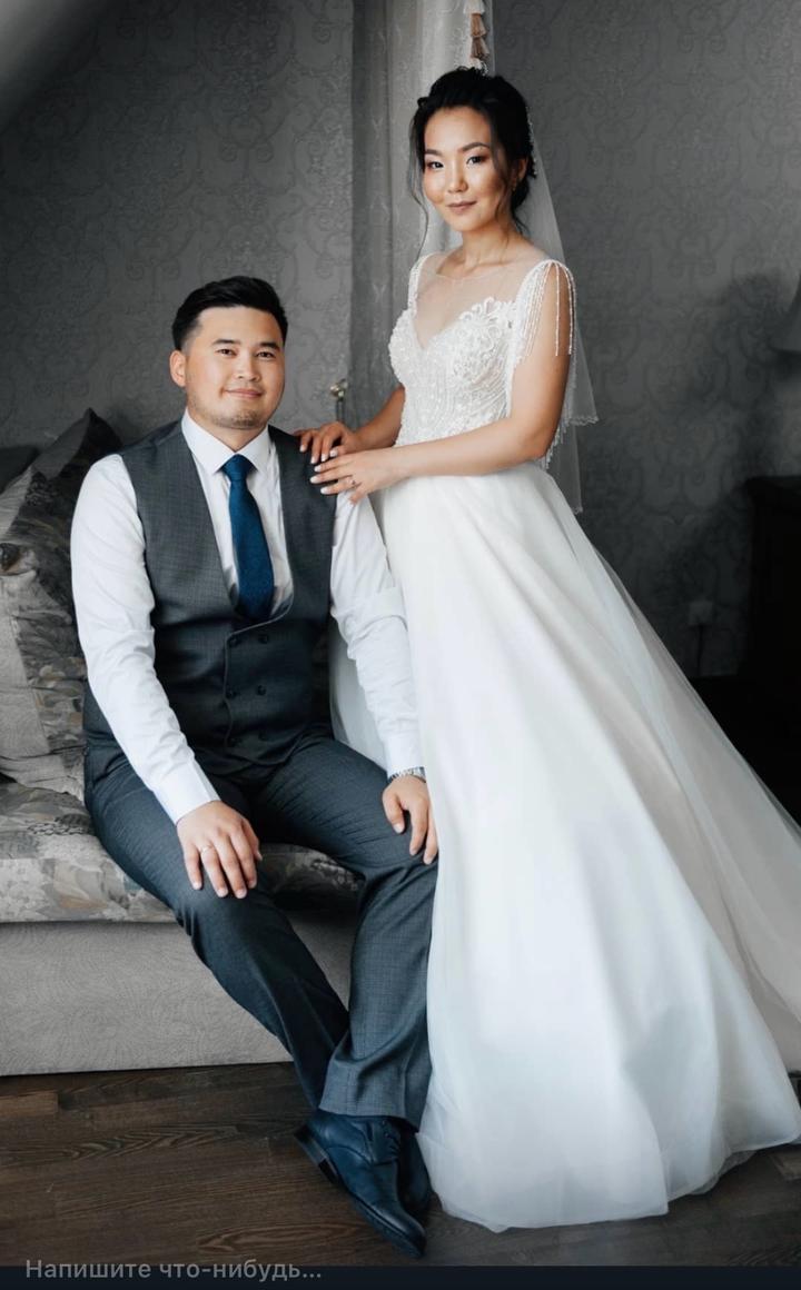 свадебное платье с салона, очень красивое. Корсет сзади на пуговицах, бисеры ручной работы- очень красиво блестят. Вживую платье очень красивое. Размер хС-С, примерно 42-44. На рост 165-168. Есть небольшой шлейф, который собирается при желании. После полной химчистки Артикул: 503852