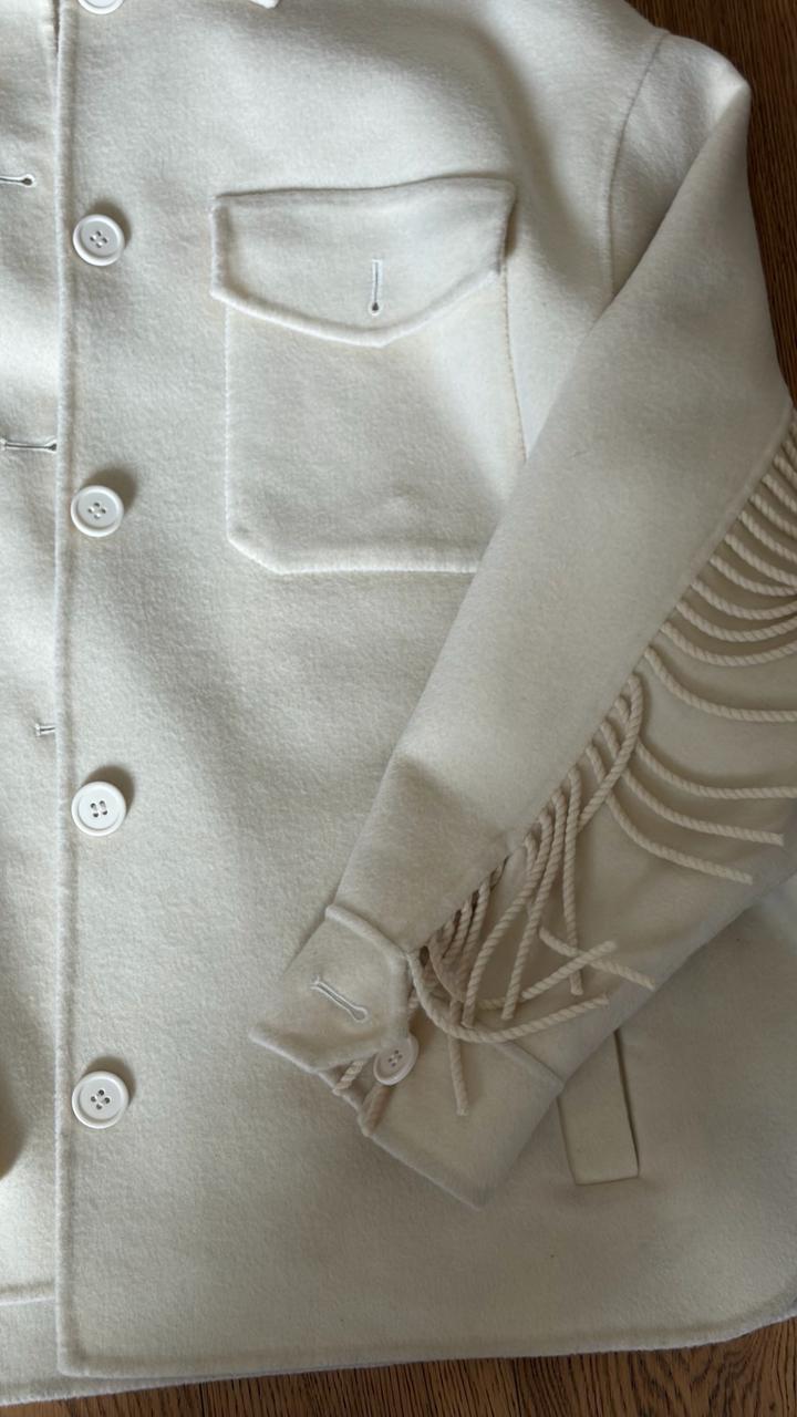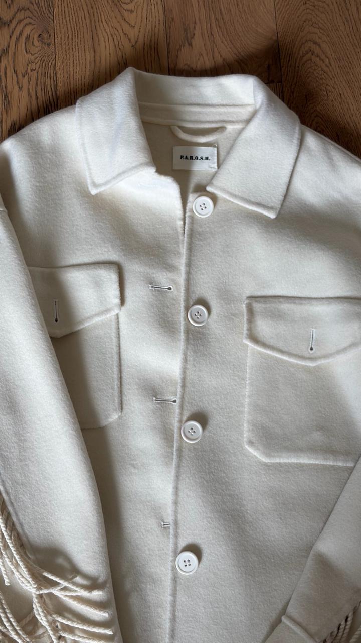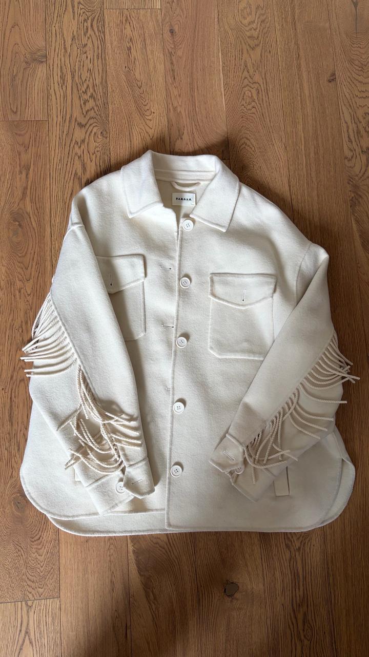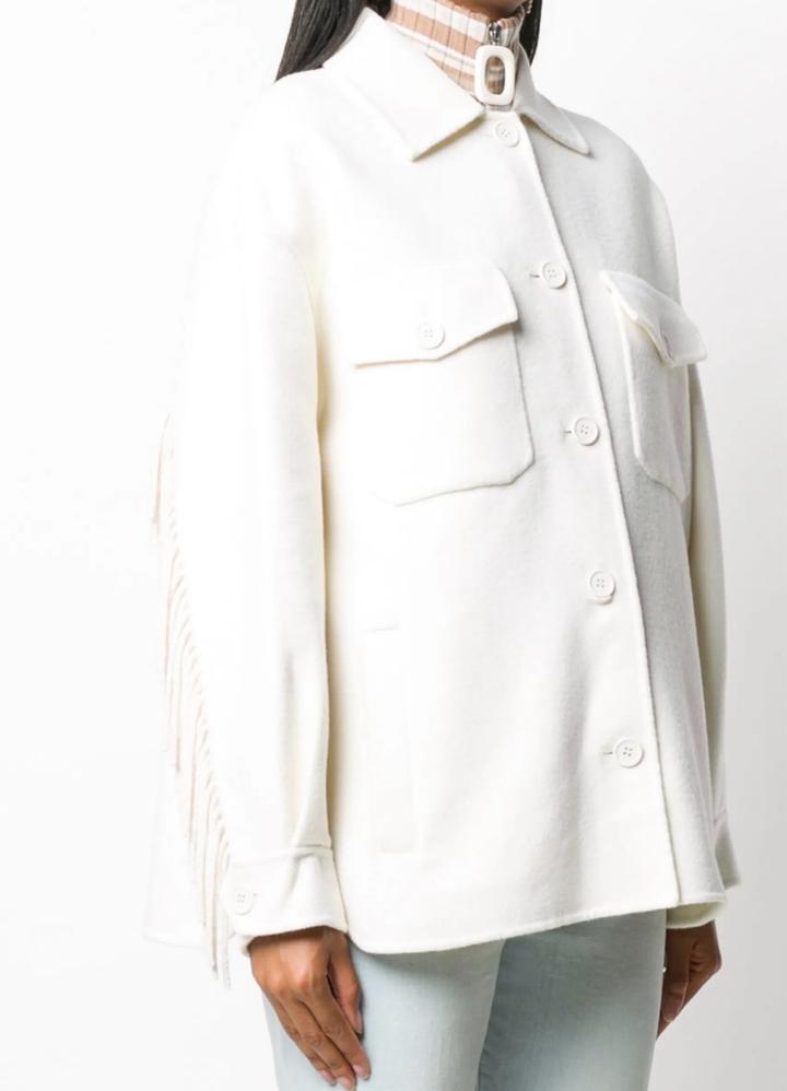 Куртка-рубашка из 100% шерсти с бахромой Классический воротник, длинные рукава, застежка на пуговицах спереди, нагрудный карман на двух пуговицах и закругленный подол. Артикул: 503870