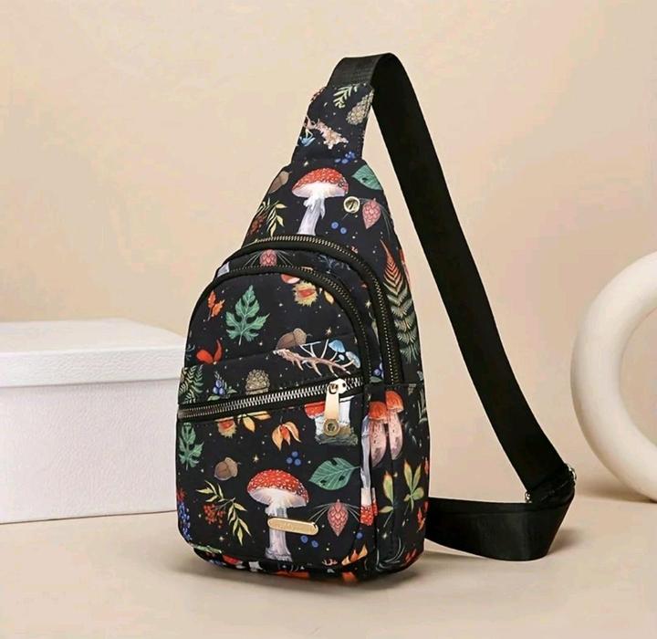 Черная сумка через плечо рисунком грибочки. Очень удобная в повседневной носки. Сумка-рюкзак из нейлона с регулиреумой лямкой Артикул: 504025