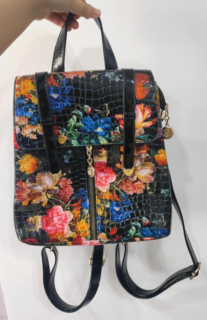 Черный лаковый рюкзак с цветами. Рюкзак имеет два отделения, в одном два кормашка без замка, во втором один карман на замке, спереди и сзади также есть карман на замке. Ручки перекрепляются и рюкзак можно носить как сумку. Артикул: 504868
