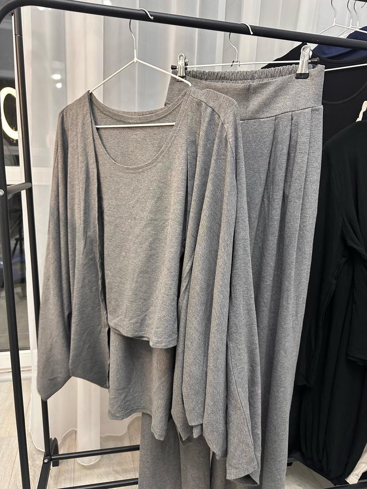 Серая и коричневая тройка. размер С-М. Брюки свободные, майка и кардиган как летучая мышь. Очень удобная и свободная. Качество отличное. Новое. Цена за одного 18000 тг Артикул: 504933