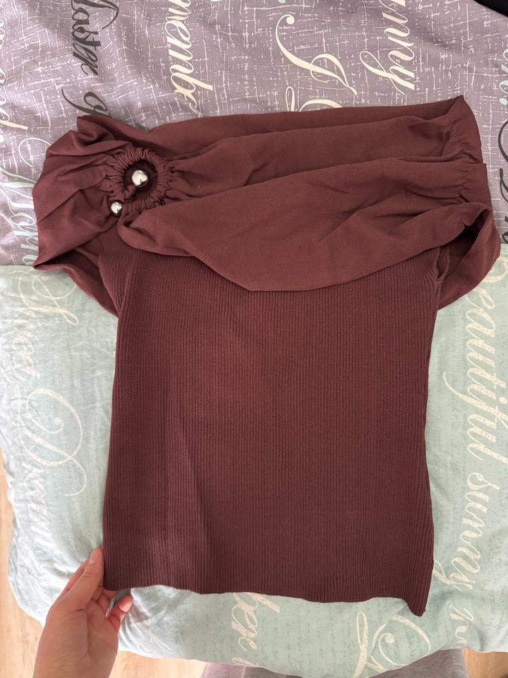 С открытыми плечами и красивой деталькой с правой стороны. Размер S. Носила один раз, уже не подходит. Бордовый красивый, женственный. С юбками или штанами супер Артикул: 505206