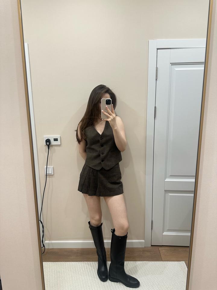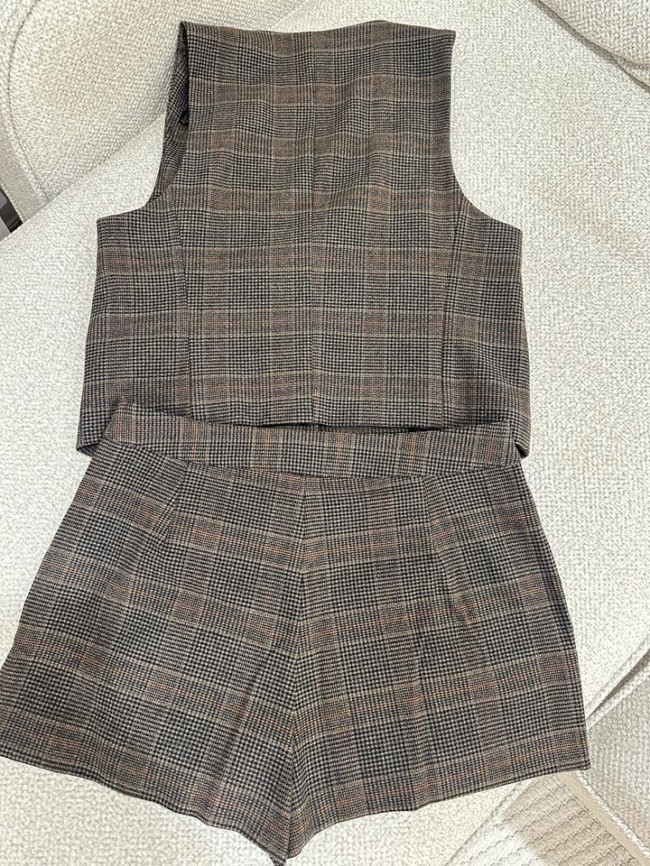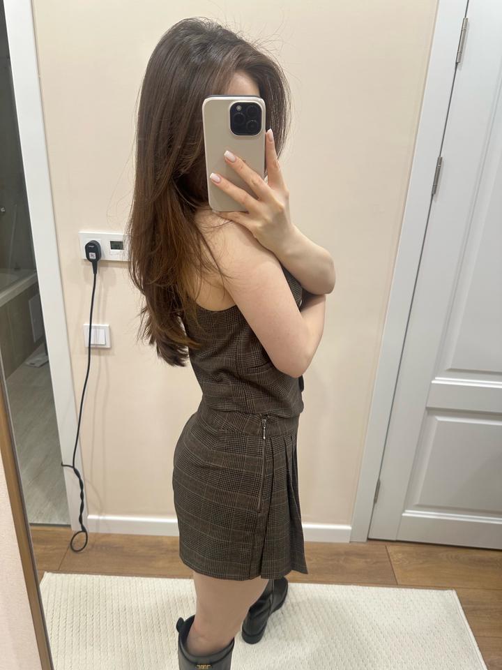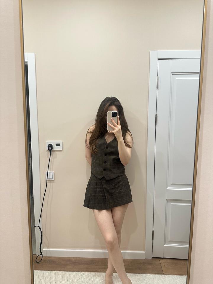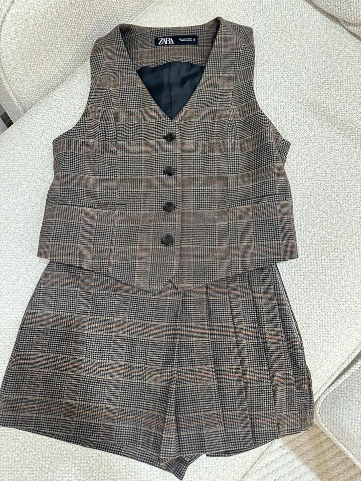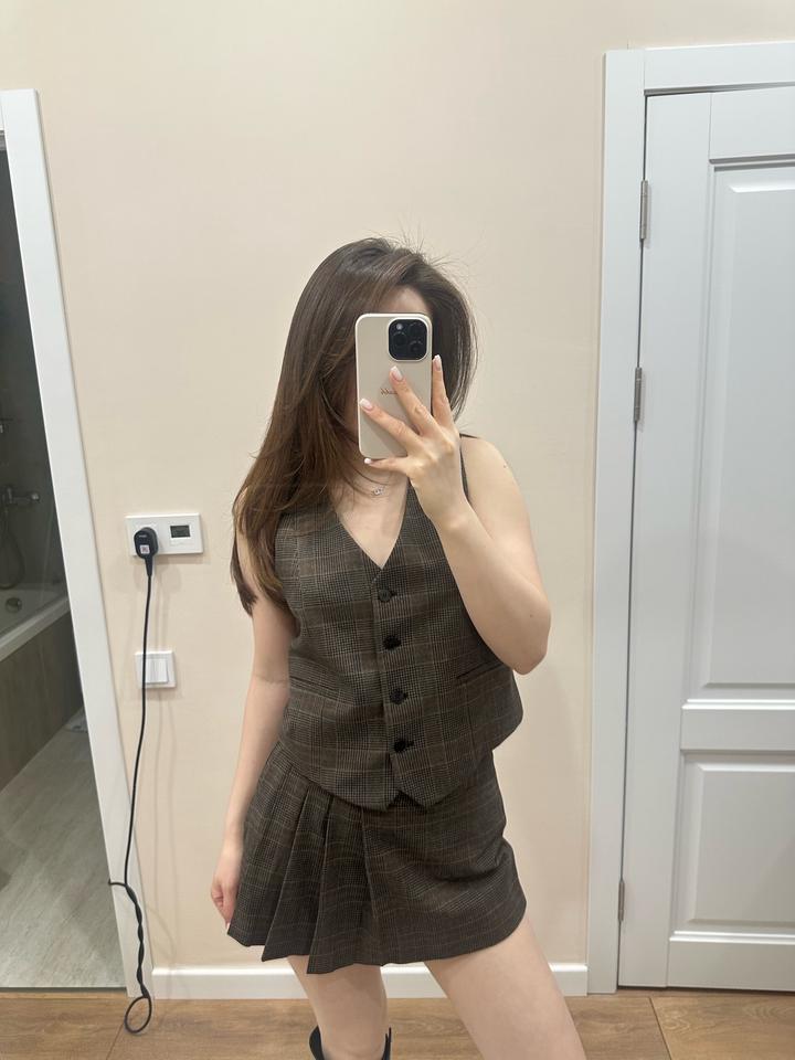 Коричневая двойка от Zara, жилет с юбка-шорты. Спереди как юбка, сзади шорты. Надевала всего раз, в идеальном состоянии. Размер идет S. Мой рост 171, вес 62, шорты мне малы, сзади в обтяг прям. Артикул: 505900