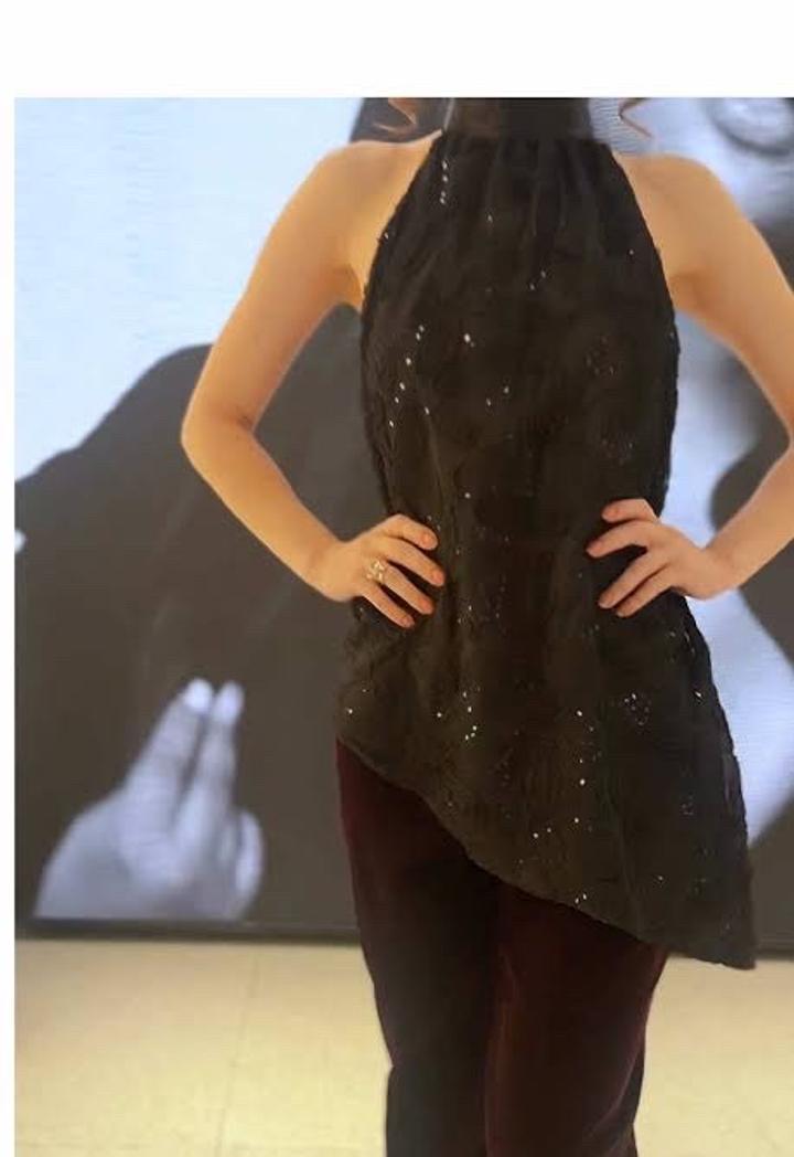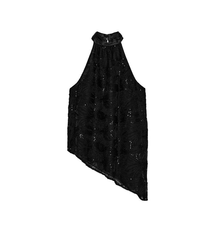 Топ с воротником халтер и асимметричным низом. Фактурная ткань с вышивкой и пайетками. Застежка на пуговицы сзади. Новый, с биркой, ни разу не носили. Размер М. Свободная посадка. Артикул: 505925