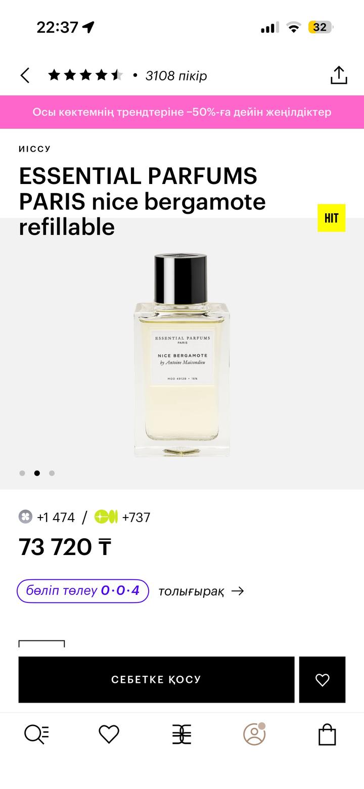Оригинальный парфюм ESSENTIAL PARFUMS PARIS, с ароматом бергамота, лимона, свежего имбиря и с нотками древесины. Идеальный аромат - для тех, кто любит свежий аромат, не тяжелый и не давящий на голову или носик. Подходит для повседневного использования, аромат весеннее летний. Идеальный аппликатор, пшыкается очень красиво и залипательно:) Не подошло по аромату мне, так как я больше близка к пудровому аромату. Сама баночка использована 93%. В отличном состоянии, упакую в пупырку и доп коробку. Артикул: 506080
