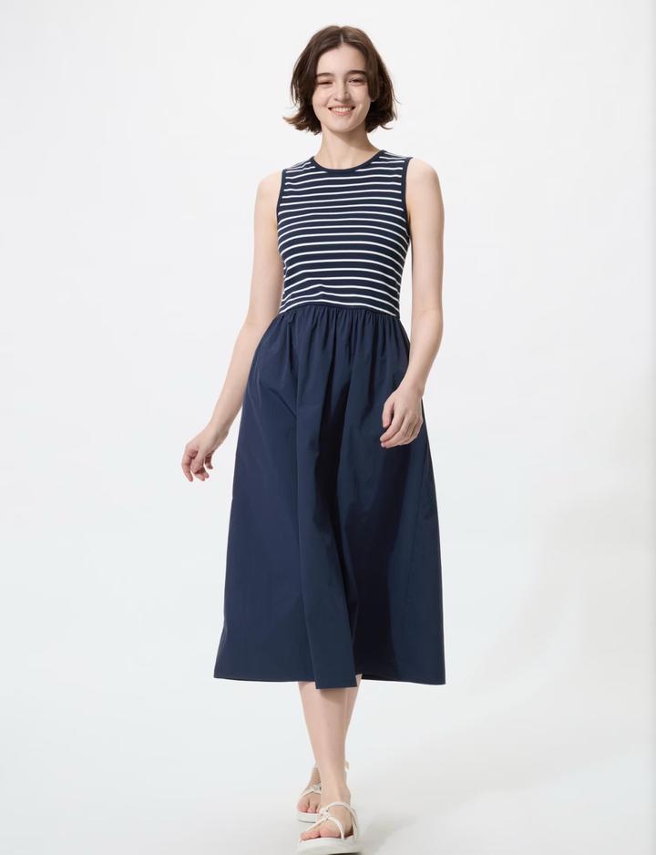Платье Uniqlo Цвет Navy. Комбинированный дизайн, сочетающий облегающий топ в рубчик и юбку из нейлоновой тафты со сборками. Характеризуется силуэтом «приталенный верх и расклешенная юбка». Имеется боковой карман. Размеры M,L. Артикул: 506657