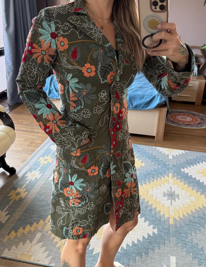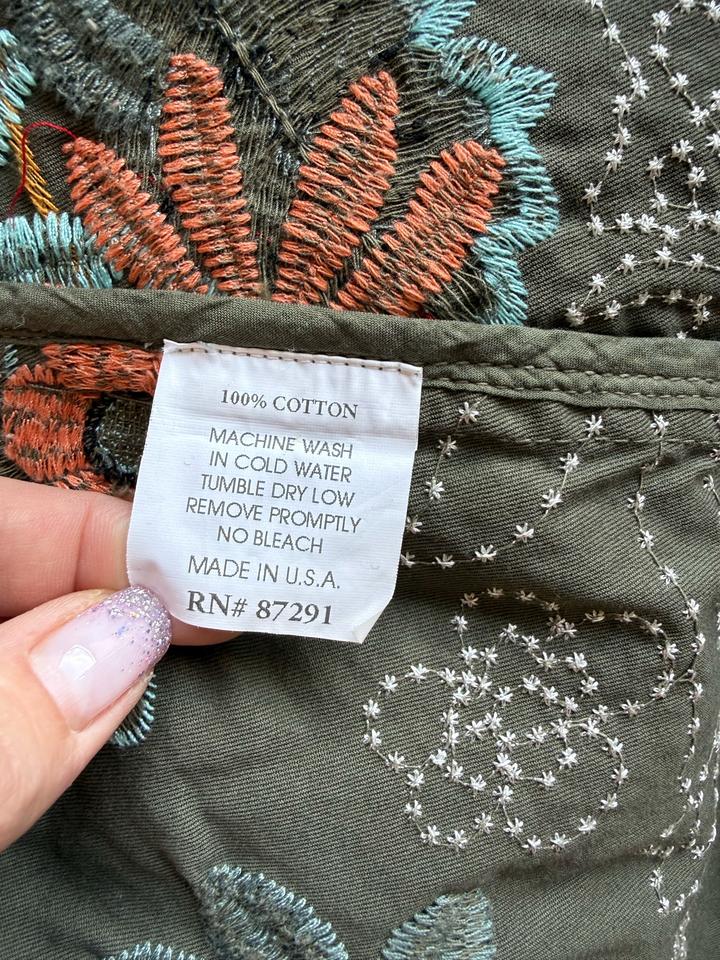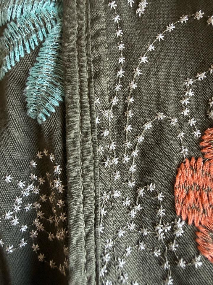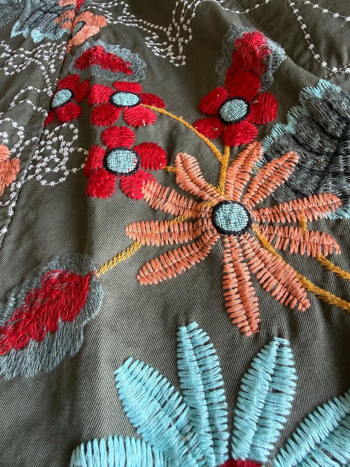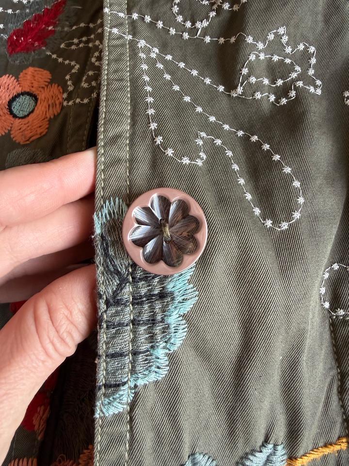 Очень красивый дизайнерский жакет-пальто от бренда Johnny Was — идеальная вещь в стиле boho / quiet luxury с акцентом на вышивку. Выполнен из плотного 100% хлопка Роскошная художественная вышивка по всей поверхности Цвет — благородный хаки с акцентами терракота, бирюзы и красного Можно носить как жакет, лёгкое пальто или как платье.Приталенный силуэт — подчёркивает фигуру Декоративные пуговицы в цветке — очень стильная деталь Смотрится дорого и необычно — такая вещь сразу собирает образ Артикул: 506662
