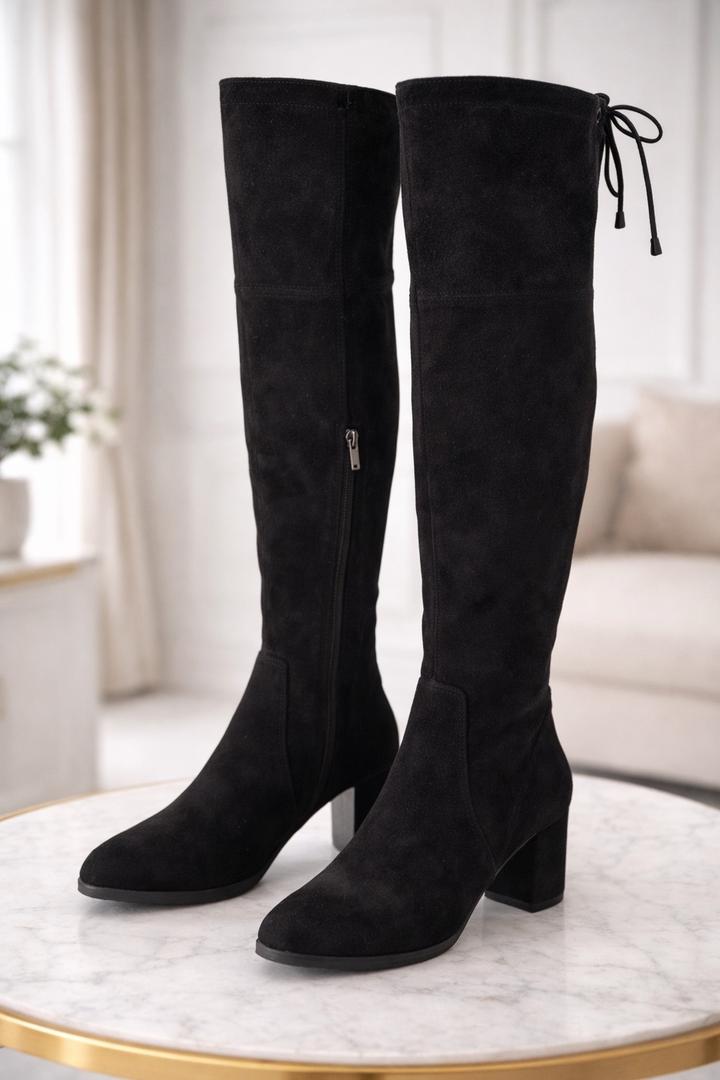 Продаются стильные ботфорты (сапоги выше колена) — идеальный выбор для уверенной и современной женщины. — Замша (мягкая, бархатистая) — Глубокий черный цвет — универсальный luxury — Удобный устойчивый каблук — Аккуратная молния сбоку — Завязки сверху красиво фиксируют ногу — Визуально удлиняют ноги и стройнят силуэт Подходят под: — Платья, юбки, пальто — Деловые и вечерние образы — Осень / весна / мягкая зима Артикул: 506953