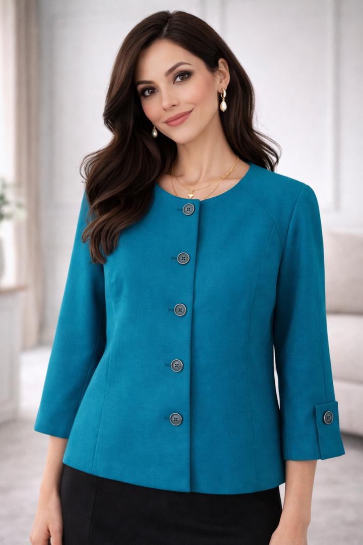 Идеальный жакет «на все случаи жизни» — Глубокий бирюзовый цвет — выглядит очень дорого — Минималистичный европейский стиль — Аккуратный крой — красиво сидит по фигуре — Укороченная длина — идеально с платьями и брюками — Оригинальные пуговицы — добавляют стиль Артикул: 507015