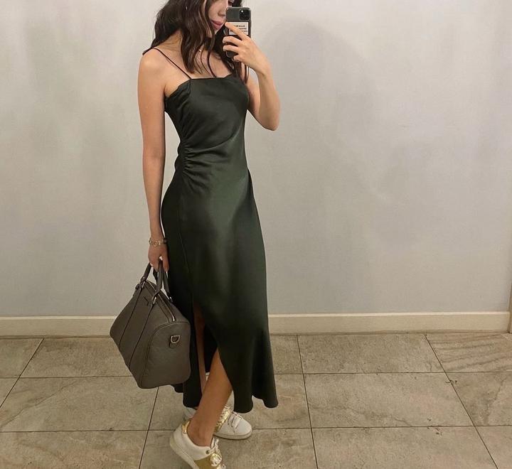 Платье-комбинация Zara. Очень красивый оттенок хаки. Есть небольшой разрез, длина миди. Имеется спереди небольшая сборка, которая визуально корректирует зону живота. Размер S. Надела пару раз на выход. Артикул: 507491