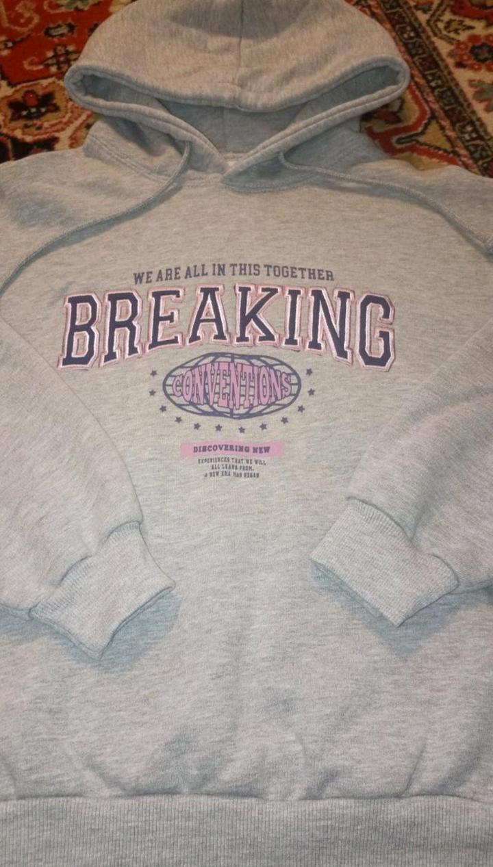 Серая худи pull&bear с капюшоном в идеальном состоянии! Удобная и мягкая. Принт «Breaking Conventions». Функциональный капюшон. Размер 40-42 Состав материала: 55% хлопок 45% полиэстер Артикул: 507584