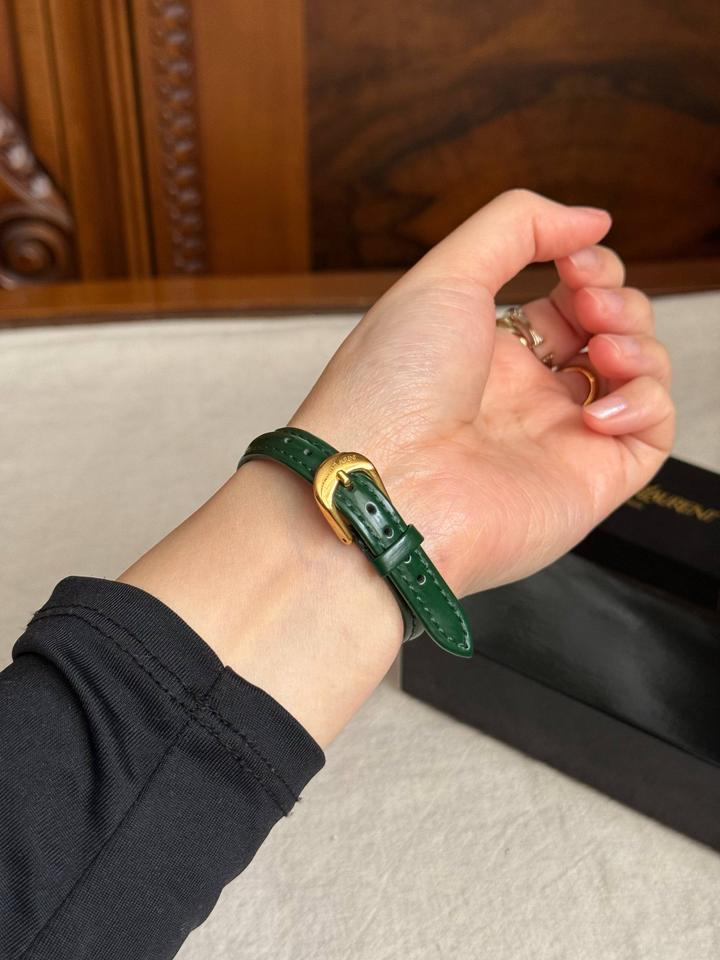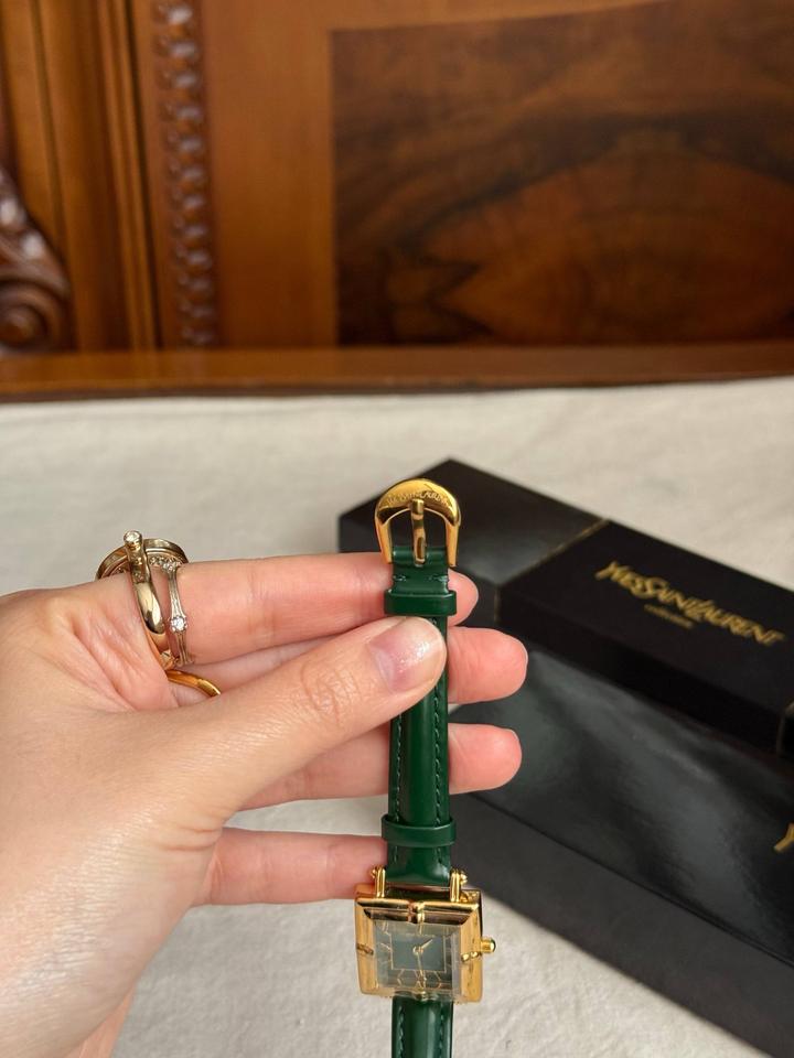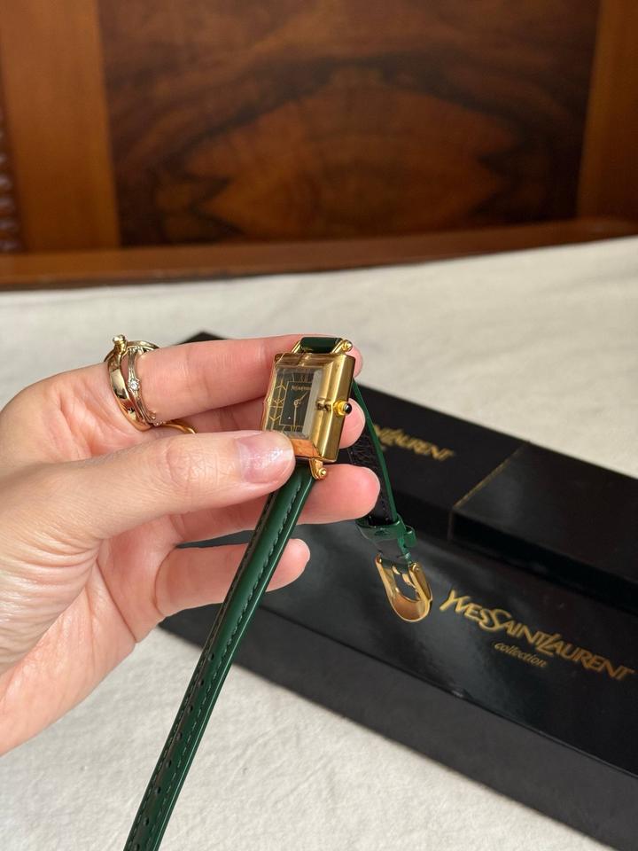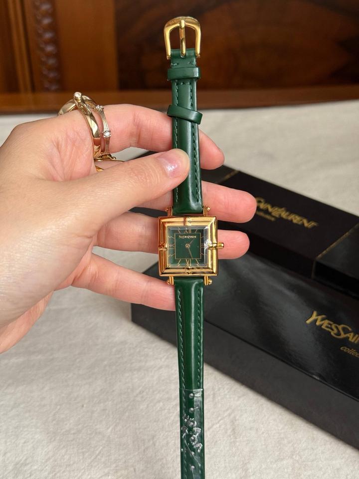 Винтажные часы YvesSaintLaurentCollection, новые, в коробке + шкатулка, идут в пленках! В стиле old money и очень напоминают винтажные Cartier Tank🙈 Зеленый циферблат, позолоченная фурнитура, японский кварцевый механизм💚зеленый ремешок из натуральной кожи (регулируется по размеру на любую кисть)! Артикул: 507935