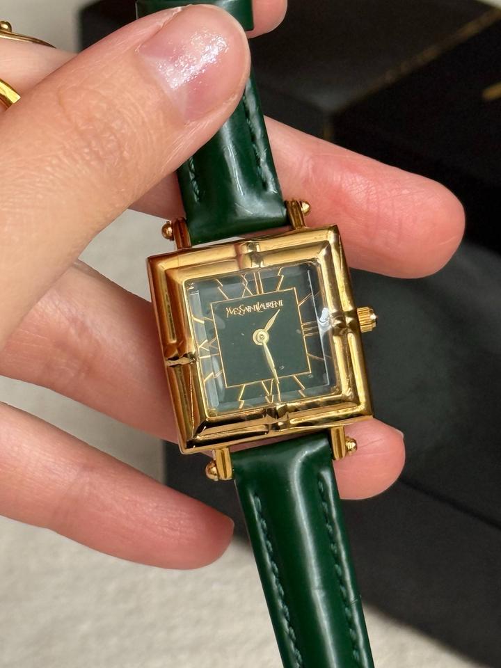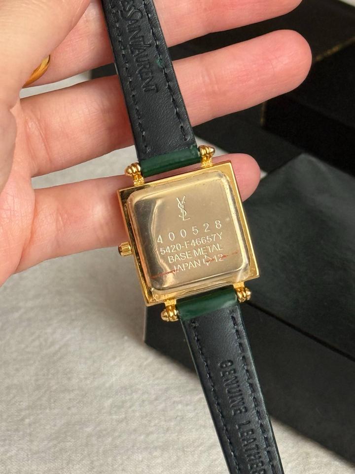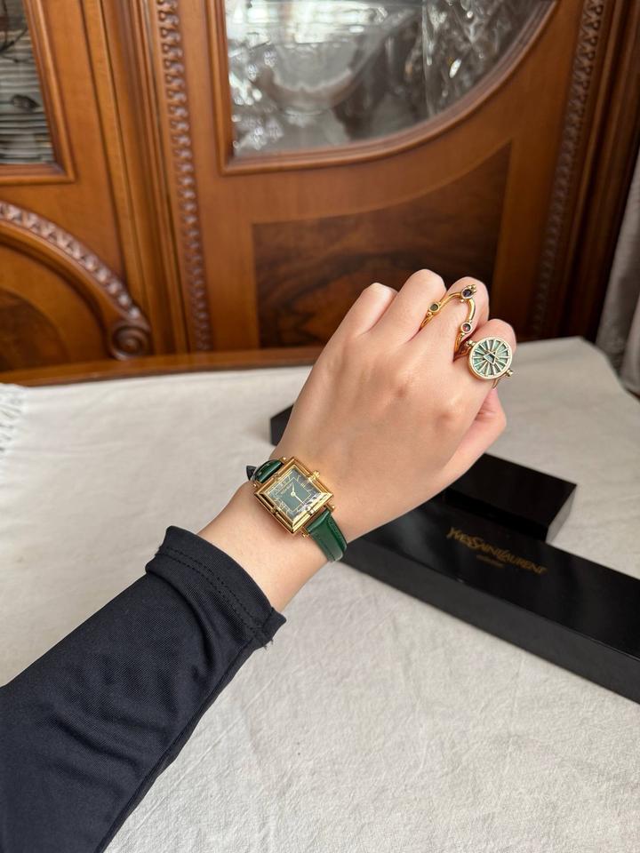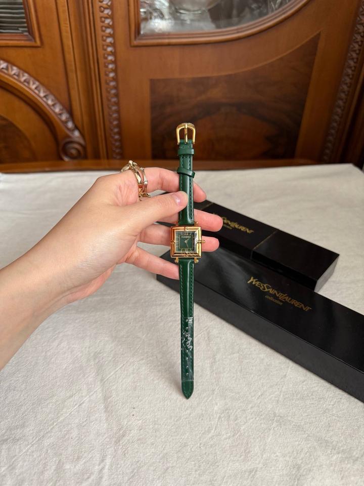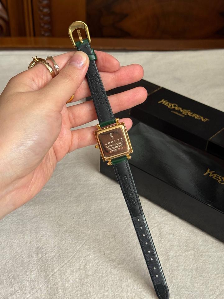 Винтажные часы YvesSaintLaurentCollection, новые, в коробке + шкатулка, идут в пленках! В стиле old money и очень напоминают винтажные Cartier Tank🙈 Зеленый циферблат, позолоченная фурнитура, японский кварцевый механизм💚зеленый ремешок из натуральной кожи (регулируется по размеру на любую кисть)! Артикул: 507935
