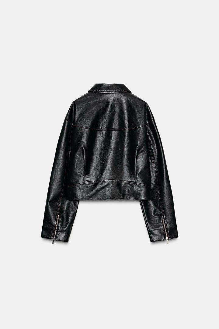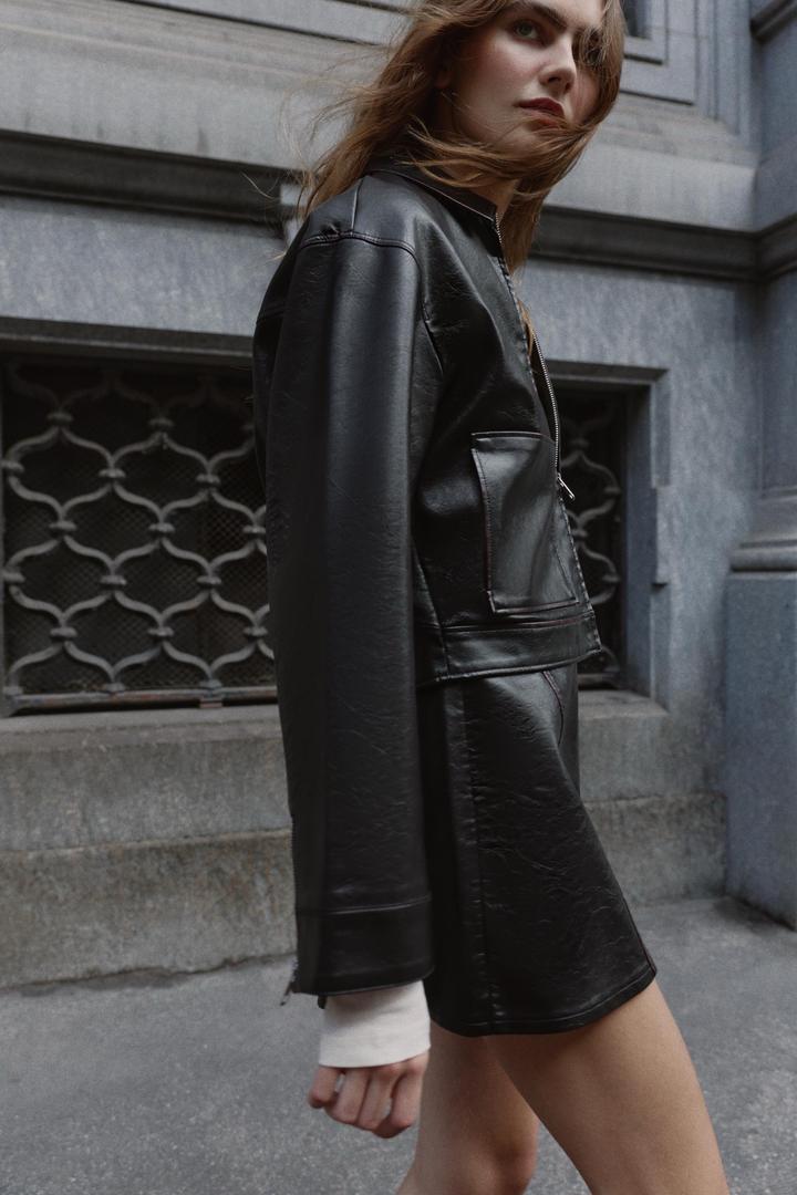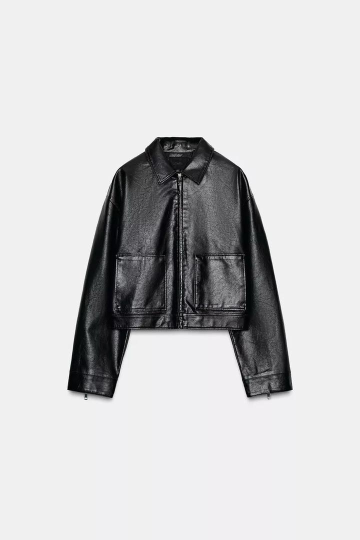Куртка Zara с отложным воротником и длинными рукавами на молнии. Накладные карманы спереди, эффект выцветшей ткани и застежка-молния спереди. Материал вверха искусственная кожа. Стильная модель, новая с биркой. По бирке xs, модель свободная на xs,s Артикул: 508038