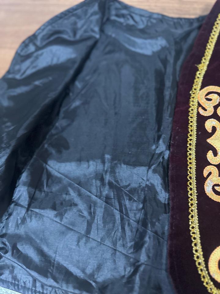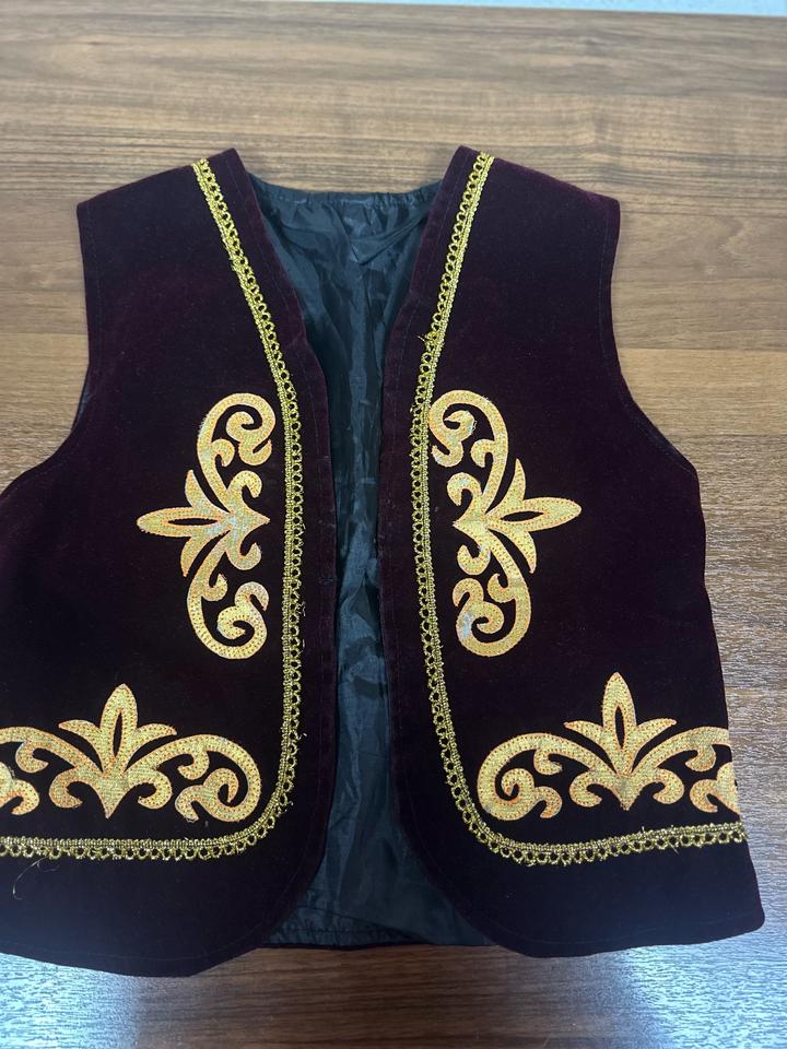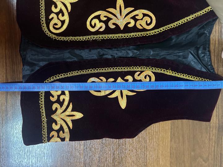 Детский национальный костюм: бархатный жилет с золотой вышивкой и лёгкая блуза с пышными рукавами. Нарядный и эффектный вариант для праздников, утренников и фотосессий. Смотрится ярко и аккуратно. Артикул: 508393
