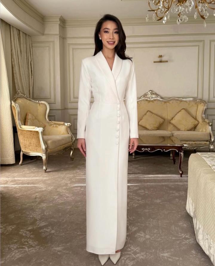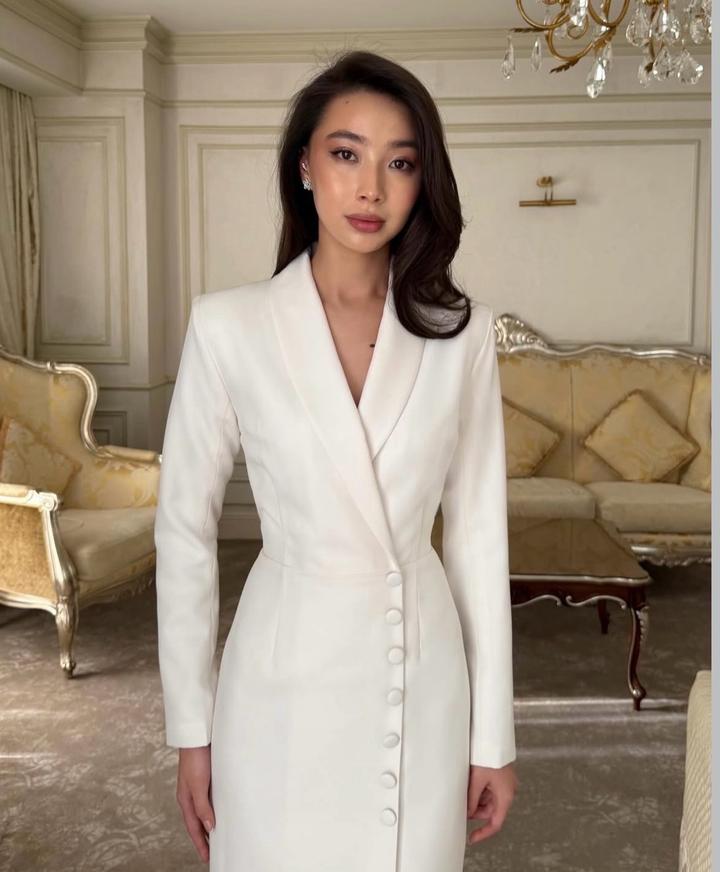 Элегантное платье-жакет в цвете айвори. Чёткая линия плеч, подчёркнутая талия и вытянутый силуэт создают безупречную посадку Артикул: 508443