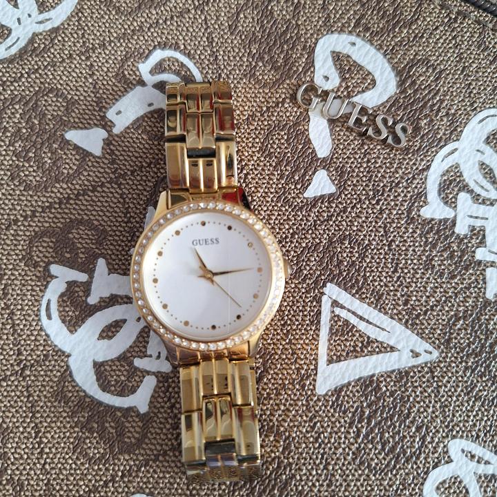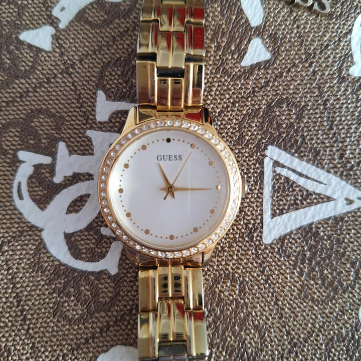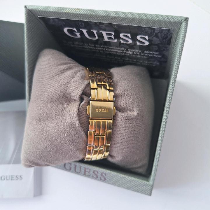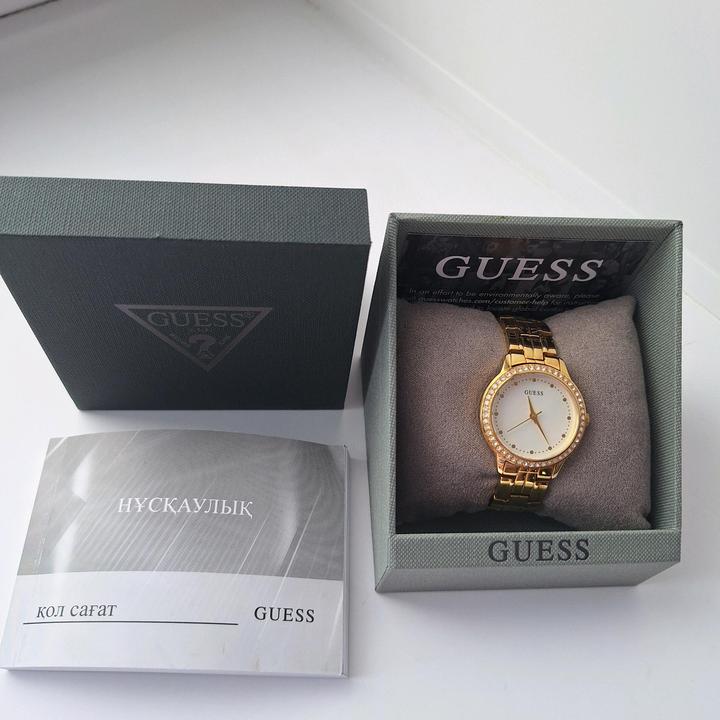Часы Guess, состояние отличное, камни все на месте, механизм работает исправно, Guess из коллекции Chelsea (модель W1209L2), выполненная в золотистом цвете. Основные характеристики включают: * Механизм: Японский кварцевый механизм. * Материалы: Корпус и браслет из нержавеющей стали с PVD-покрытием золотого цвета. Декор: Безель и циферблат инкрустированы кристаллами. * Стекло: Минеральное, устойчивое к возникновению царапин. * Водозащита: 3 ATM (выдерживают случайные брызги, но не для плаван Артикул: 508536