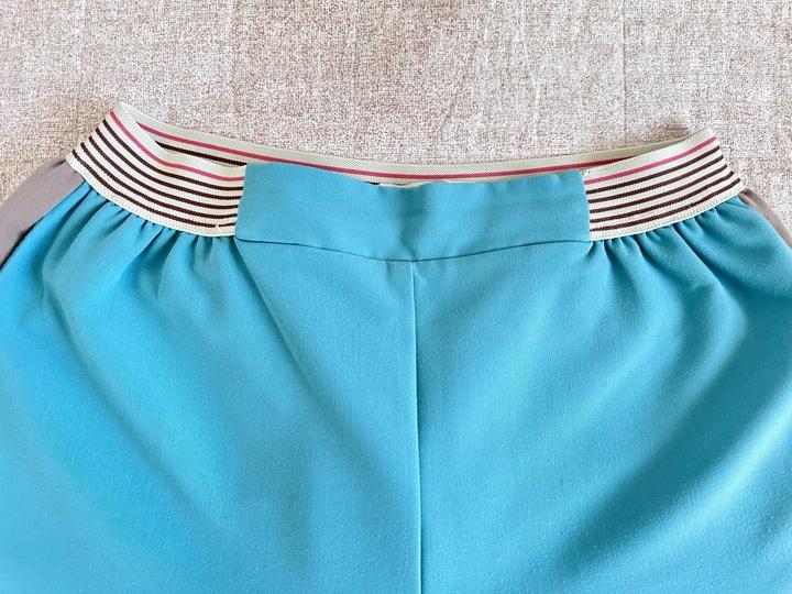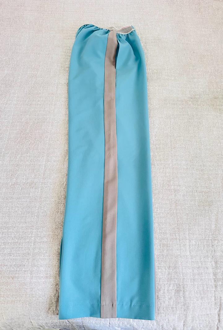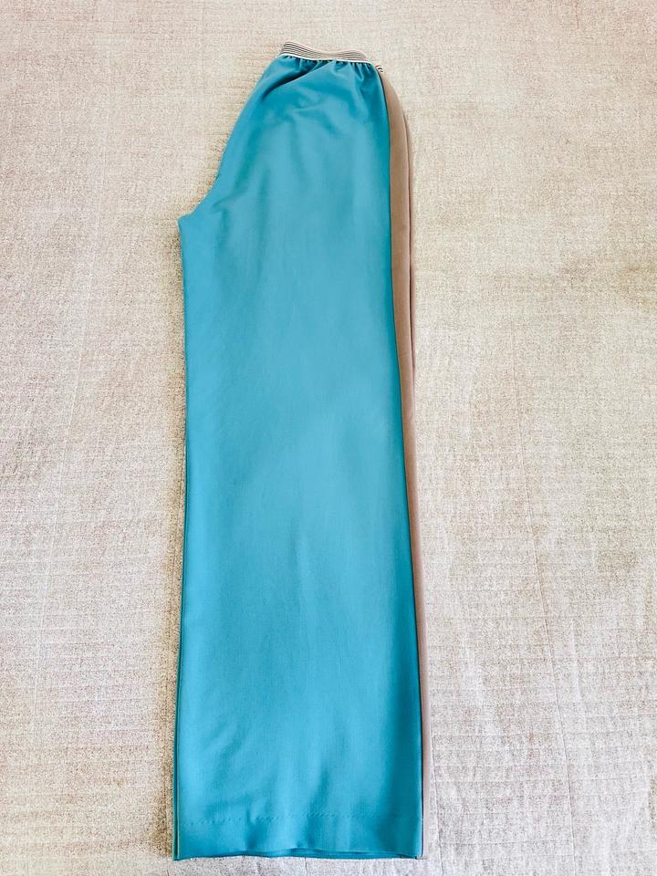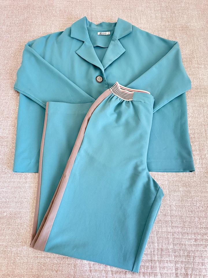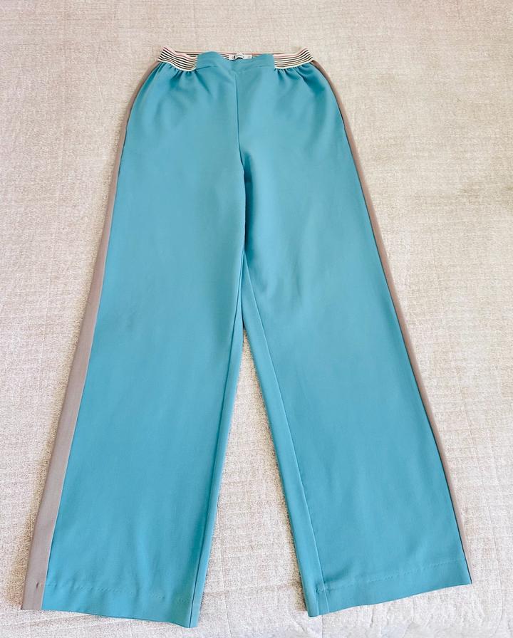 Брючный костюм спортшик. Цвет - тиффани. Брюки свободные, на резинке, по бокам имеются лампасы. Жакет свободный, укороченный. Имеется небольшой дефект на штанах, который можно исправить. Артикул: 508597