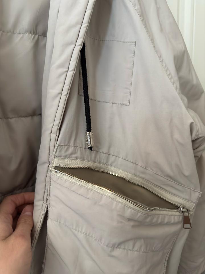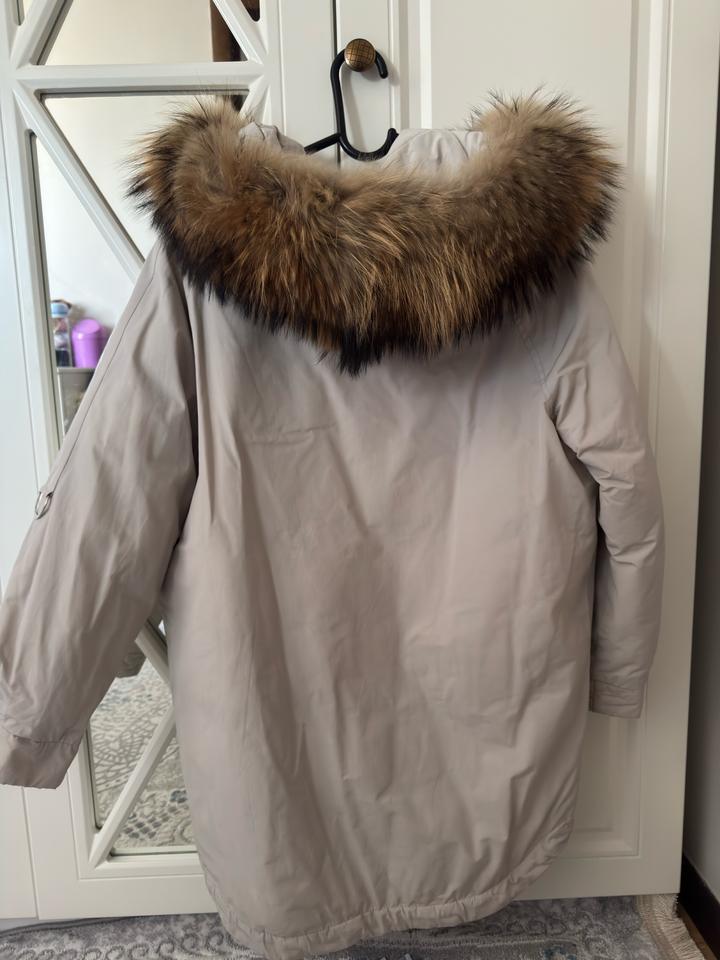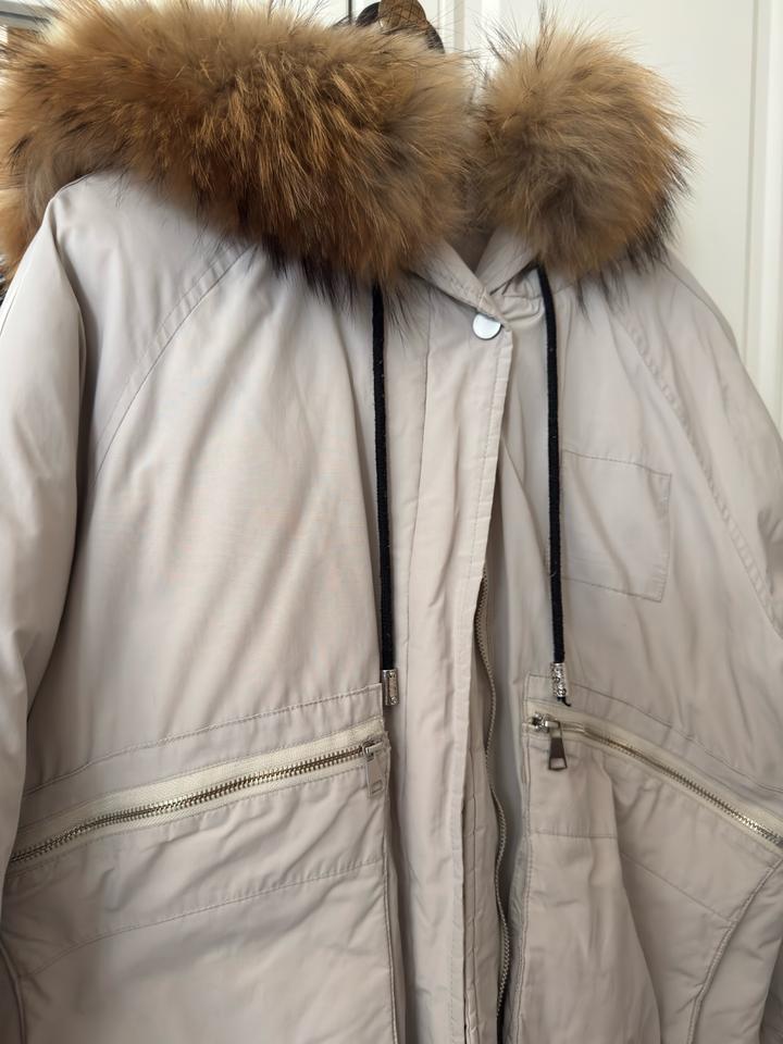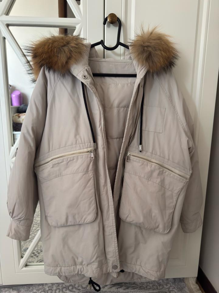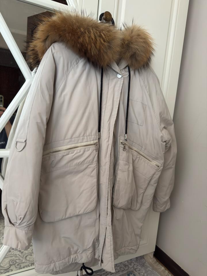 Парка в хорошем состоянии, ткань приятная, хлопок, цвет серо-молочный, мех натуральный, стиль оверсайз, после химчистки Артикул: 508616