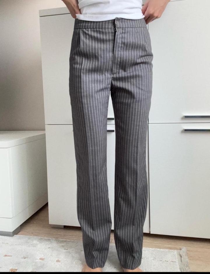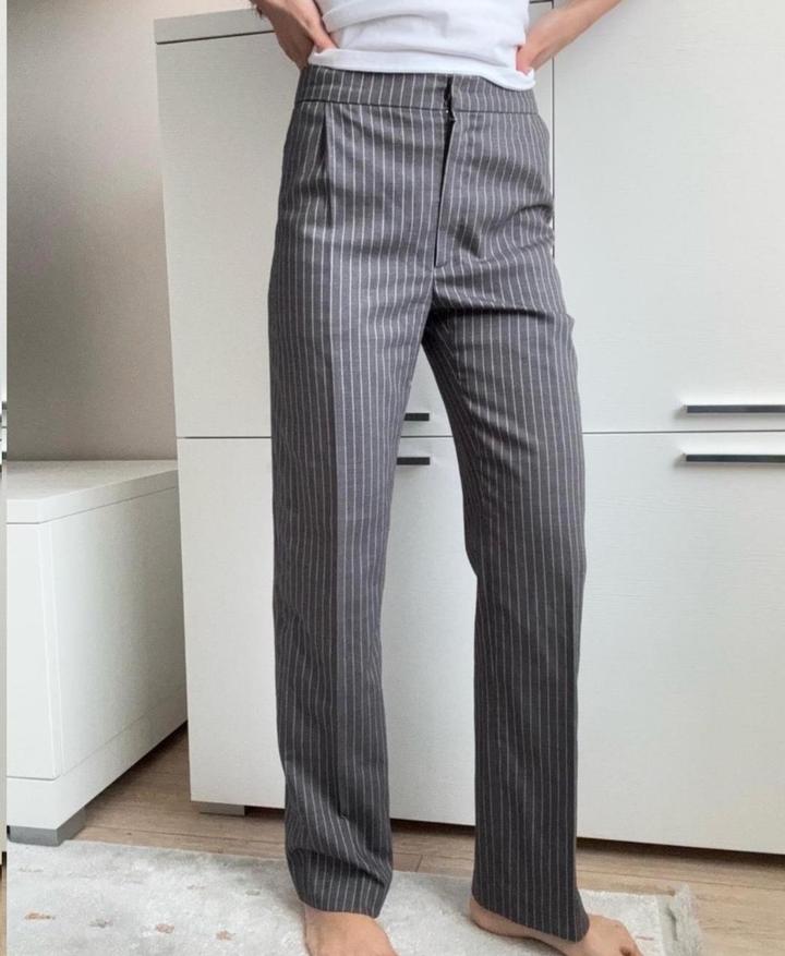 Классические прямые брюки в тонкую вертикальную полоску с высокой посадкой, подчёркивающей талию и визуально вытягивающей силуэт. К нему есть пиджак. Рост 161 см. Артикул: 508764