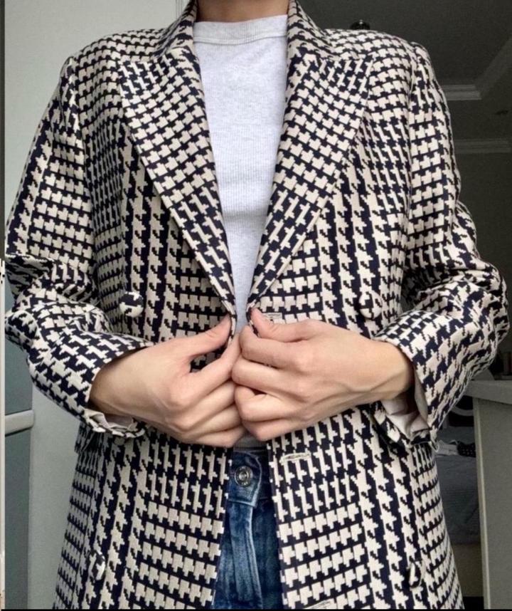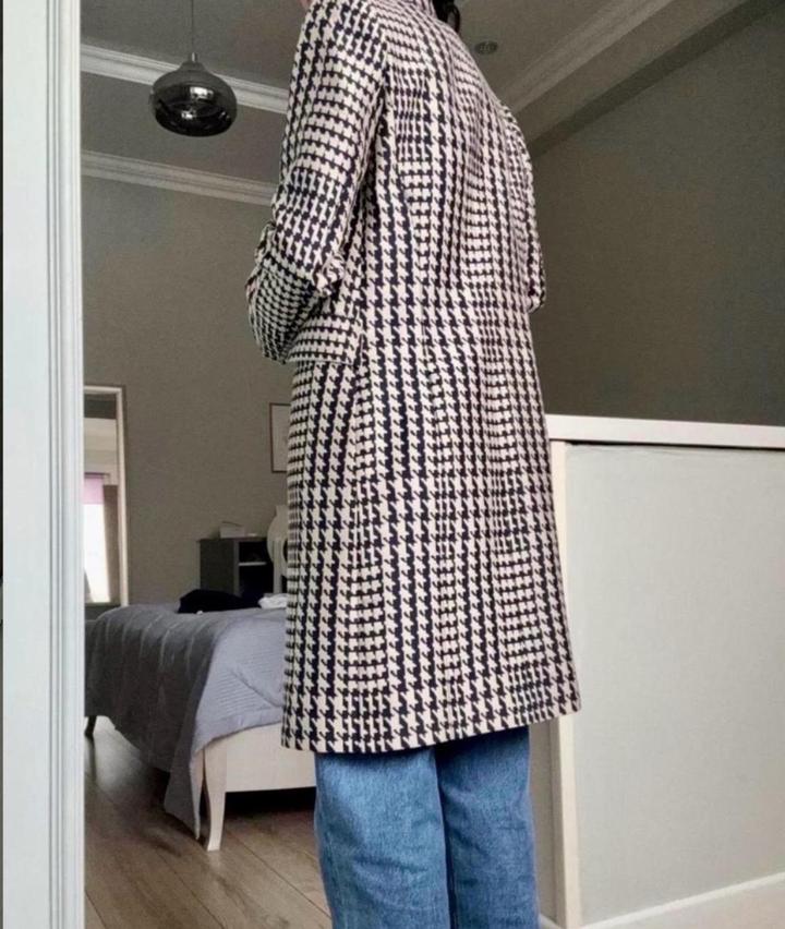 Стильный плащ-жакет в классический принт «гусиная лапка». Модель с аккуратными лацканами и длиной до колена — красиво подчёркивает фигуру и делает образ более элегантным. Плотная качественная ткань хорошо держит форму, подходит для межсезонья и прохладной погоды. Состояние отличное. Артикул: 509026