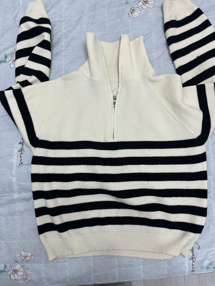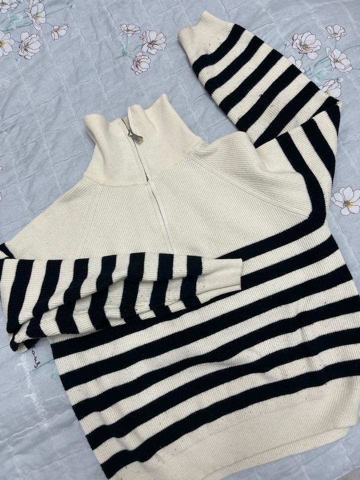 Уютный бежевый свитер с полосками Стильная модель с воротником на молнии — выглядит очень аккуратно и трендово. Мягкая вязка, приятный к телу материал, идеально подходит для прохладной погоды 🍂 Нежный бежевый цвет легко сочетается с любыми образами — от базовых джинсов до более элегантных луков. Чёрные полоски добавляют изюминку и делают вещь более выразительной. Состояние: отличное Идеальный вариант для тех, кто любит комфорт и стиль в одном Артикул: 509776