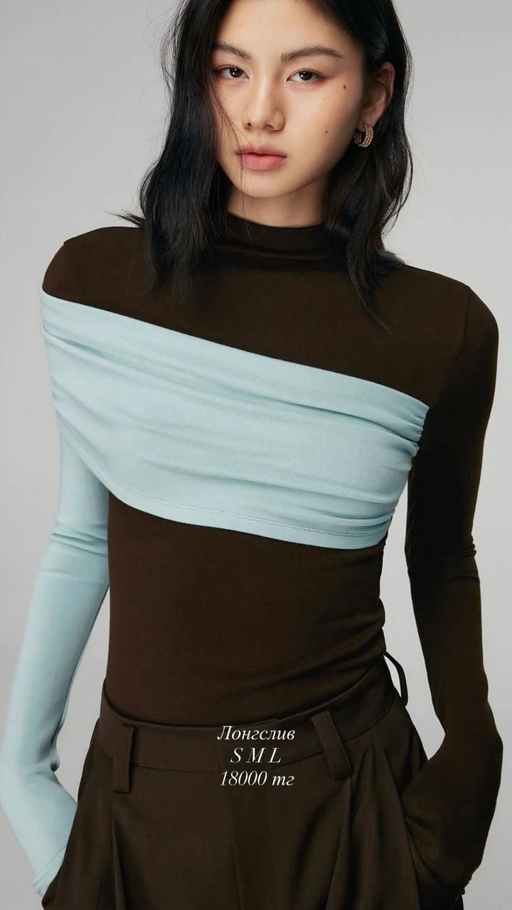 Тонкий лонгслив, не просвечивает. Интересный дизайн. Голубой с коричневым красиво сочетается. Новые. Размеры S, M, L. Артикул: 509977