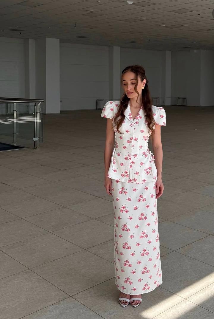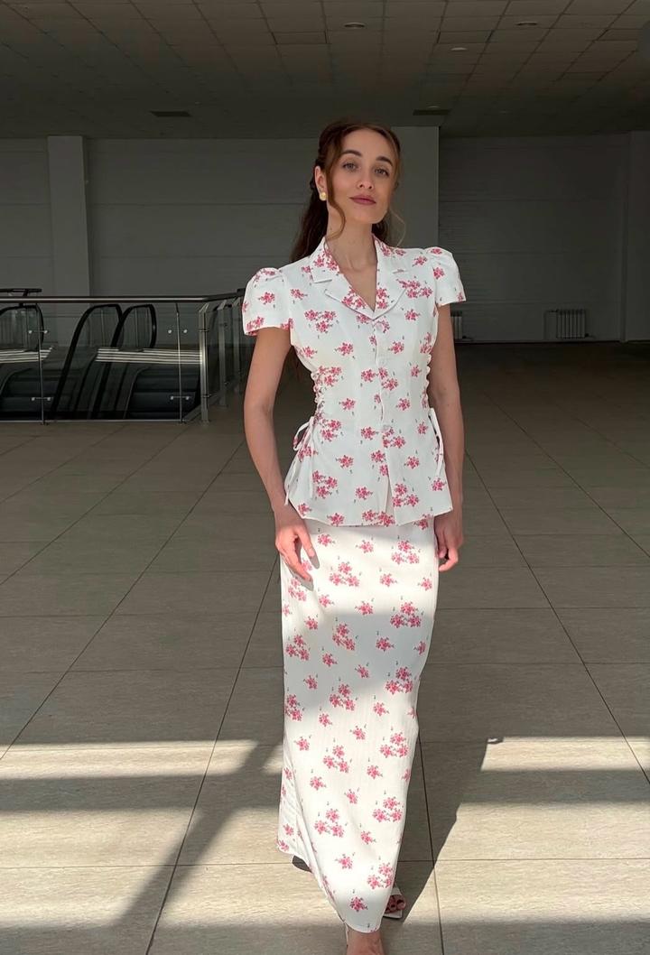 Жакет: Приталенный крой, рукава-фонарики и эффектная шнуровка по бокам для идеальной посадки по талии. Юбка: Силуэт макси, визуально вытягивает рост. Одевала 1 раз Артикул: 510094