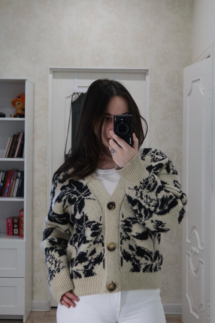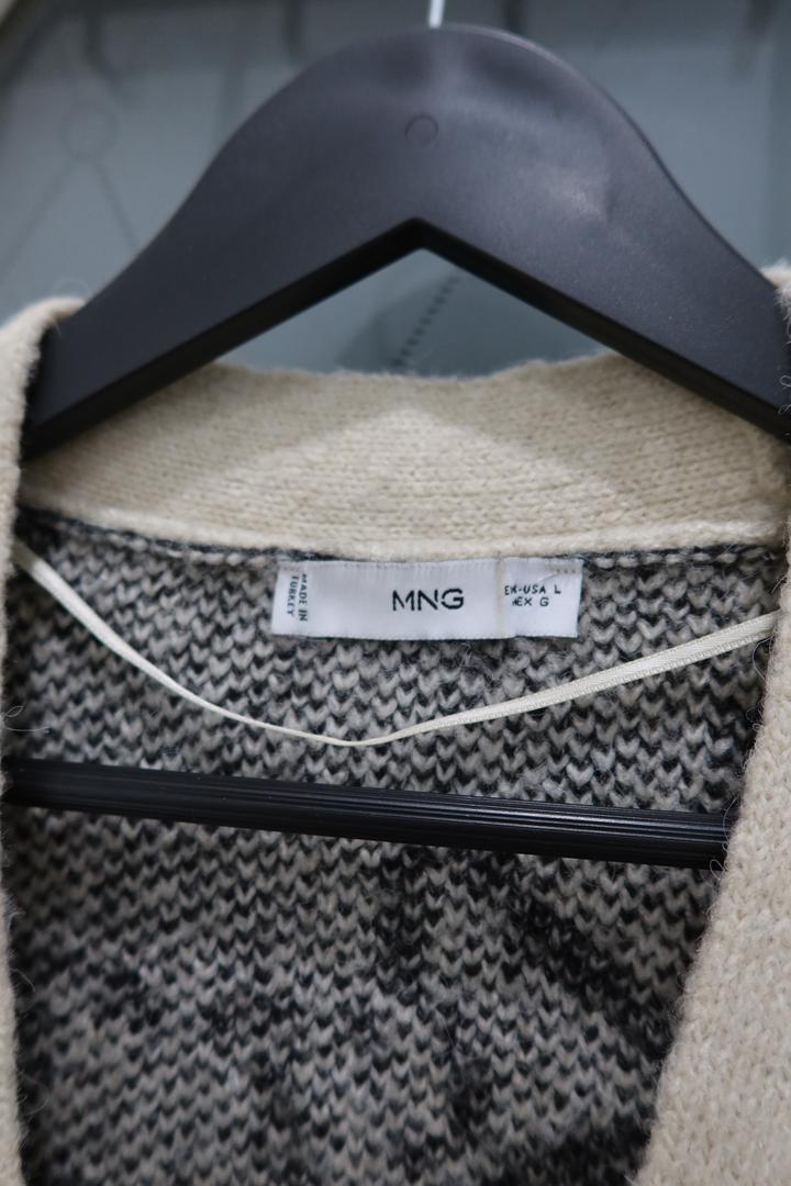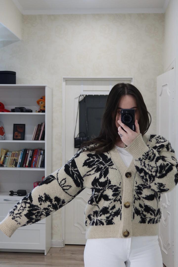Кардиган MNG 🤍 Очень стильный, мягкий и уютный, с красивым черно-бежевым узором. Отлично сидит и легко сочетается с базовыми вещами. Размер: L (можно и на M для оверсайза) Состояние: отличное Идеален на весну/осень Артикул: 510146