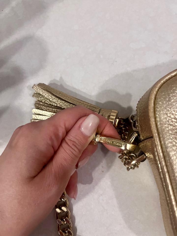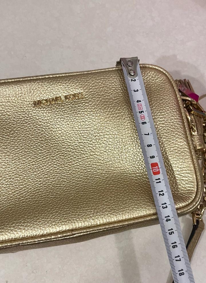 Оригинальная сумка Michael Kors в благородном металлическом золотом оттенке. Компактная и аккуратная модель из линейки Jet Set с узнаваемой формой camera bag. Покупалась в фирменном бутике Michael Kors в Париже. Носилась немного, состояние очень хорошее. Пыльник не сохранился. Фактура мягкая зернистая кожа с деликатным блеском, который красиво играет при дневном свете. Золотая фурнитура, съемный ремешок с цепочкой и декоративная кисточка добавляют акцент, но не перегружают образ Артикул: 511729