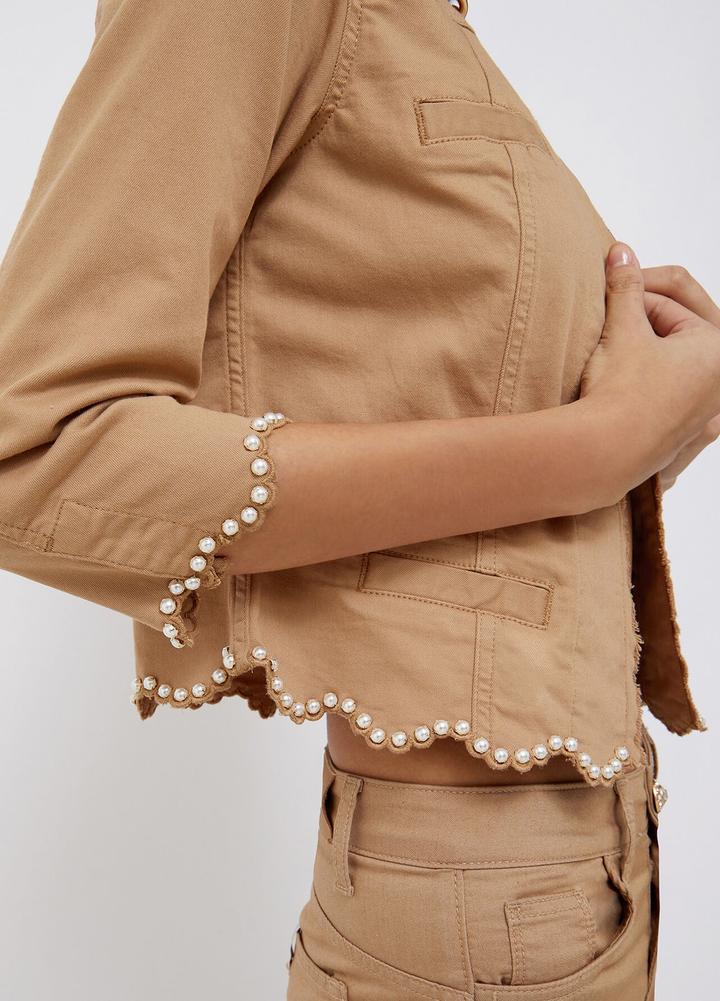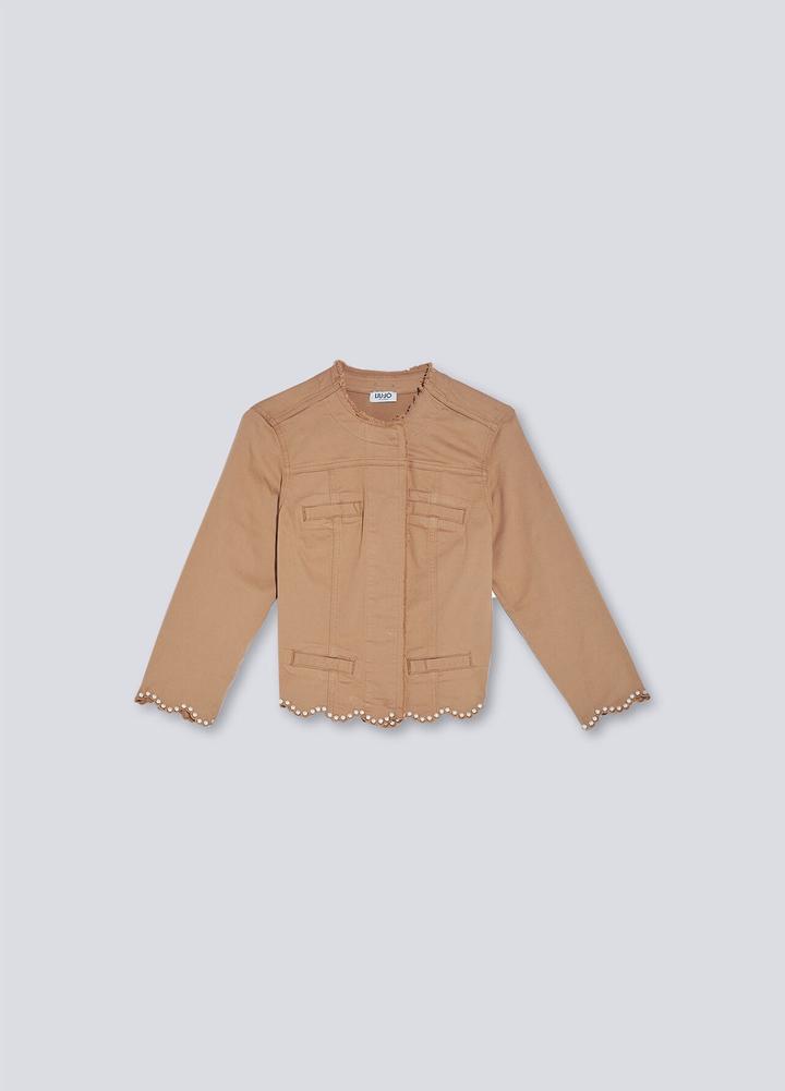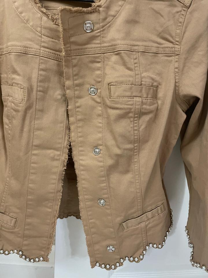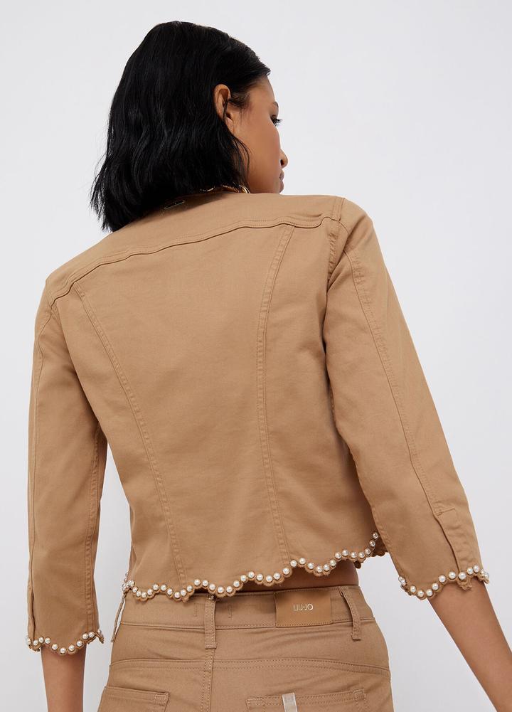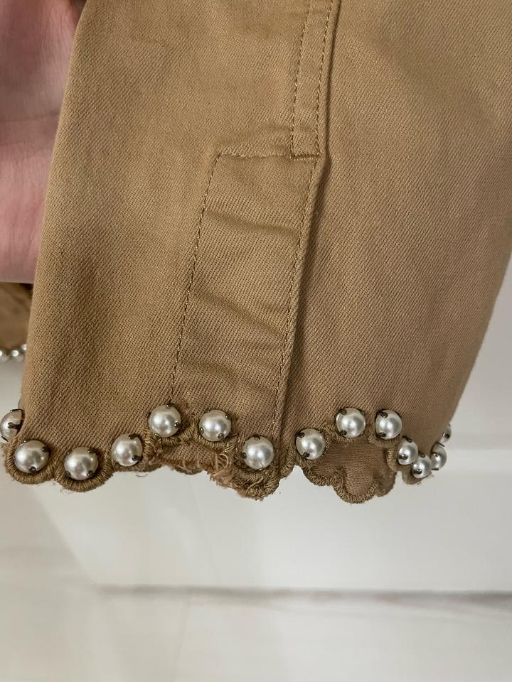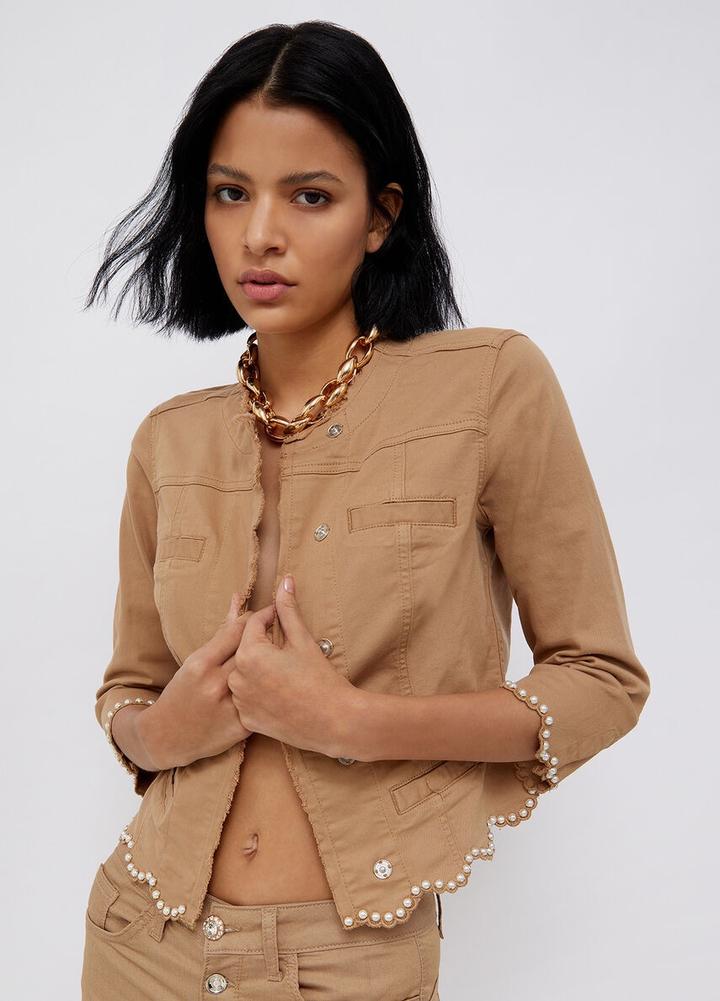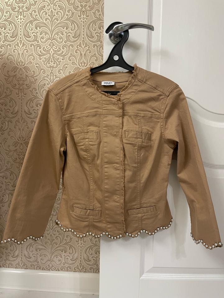 Жакет из хлопкового габардина Приталенный силуэт Рукава три четверти Отделка жемчужинами Застёжка на роскошные пуговицы В носке пару раз,был куплен за 250$ Артикул: 512109