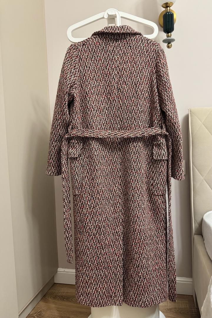 Дизайнерское пальто от Айгуль Касымовой (сделано в Казахстане). Выполнено из премиальной 100% итальянской шерсти с эффектным фактурным узором. Ткань очень теплая и плотная. Трендовый фасон: длинный пояс подчеркивает талию, есть удобные накладные карманы с клапанами. Полностью на подкладке. • Бренд: Aigul Kassymova • Размер: 38 (S/M) Длина 120 см макси • Материал: 100% Итальянская шерсть • Состояние: Отличное Артикул: 512191
