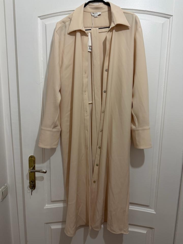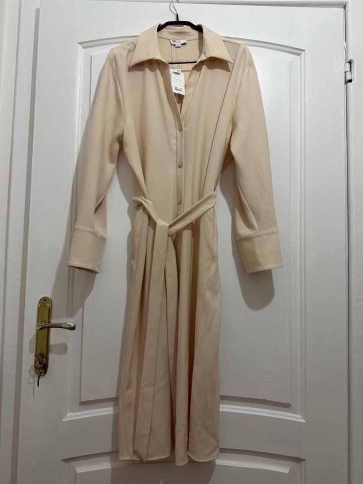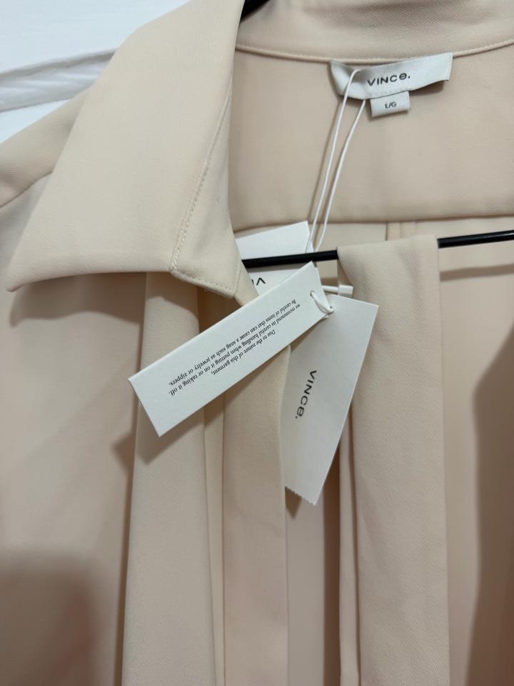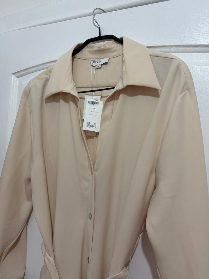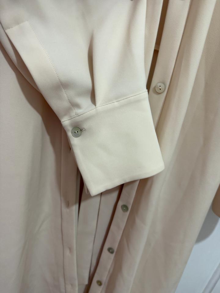 Подлинное платье VINCE, размер L. Midi длина, а А-образным кроем, верхняя часть оверсайз, с застёжкой на пуговицы на манжетах, эластичное и удобное. Своя цена примерно €450, новое с бирками. Идеально для офисного и повседневного образа. Цвет на фото немного темноват, но при близком фотографировании отразилось фактически, он ближе к сафари или молочному. Ткань: плотный полиэстер, стрейч. Артикул: 512461