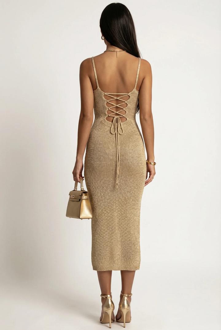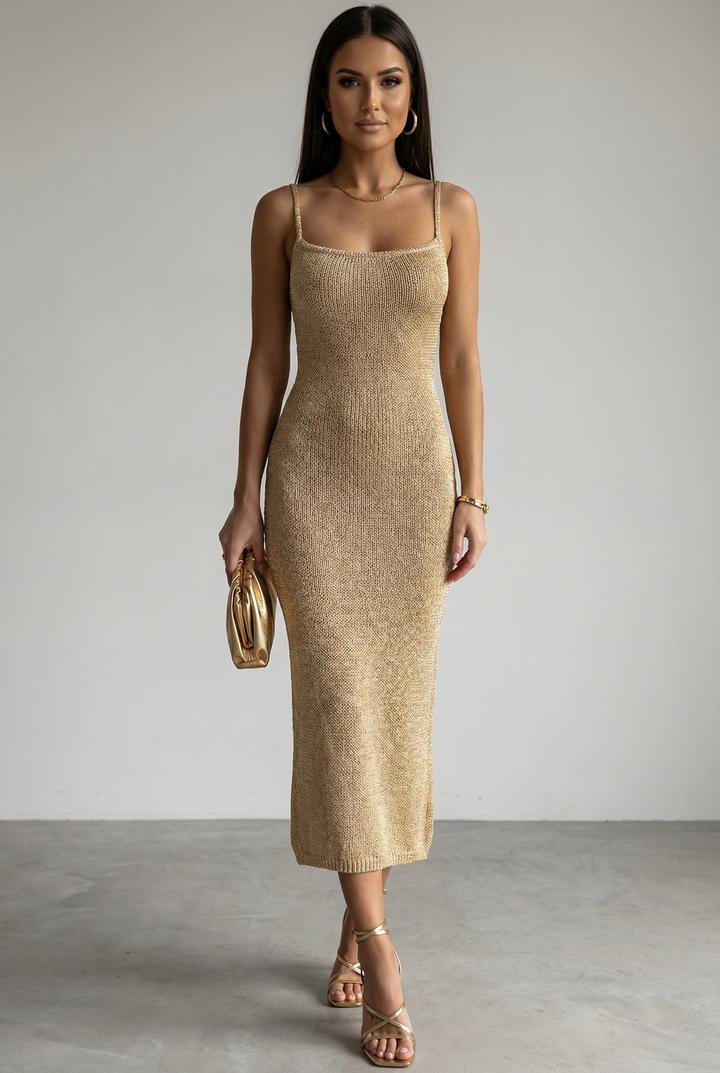 Материал: тонкий трикотаж с добавлением золотистой металлической нити. Детали: глубокий вырез на спине с регулируемой перекрестной шнуровкой и тонкие бретели. Стиль: облегающий силуэт, длина макси. Артикул: 513454
