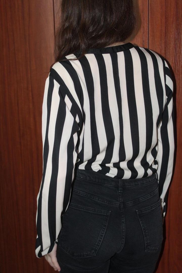 Полосатая рубашка с V - образным вырезом Состав: 100% полиэстер Состояние: прекрасное Размер: M - L Длина: 60 см Стоимость: 8000 тенге модель: рост 165, ог 83, от 73, об 101, размер M Артикул: 513727