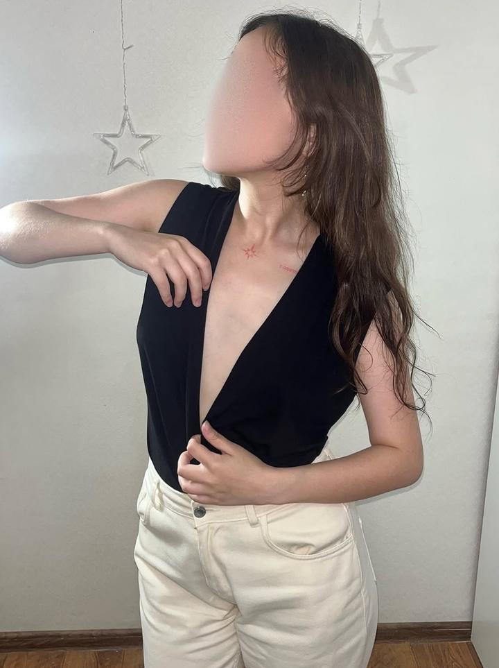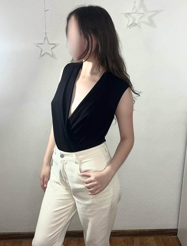 Чёрное боди с глубоким запахом Идеальный вариант для тех, кто любит комфорт с ноткой дерзкой элегантности. Мягкая, струящаяся ткань за счёт 95% вискозы в составе нежно облегает тело, подчёркивая изгибы и красиво драпируясь в зоне декольте. Глубокий V-образный вырез визуально вытягивает шею и акцентирует ключицы. Крой без рукавов открывает плечи, а лаконичный силуэт легко впишется и в вечерний, и в повседневный гардероб. Состав: 95% вискоза, 5% эластан Состояние: 10/10 Размер: М Артикул: 513735