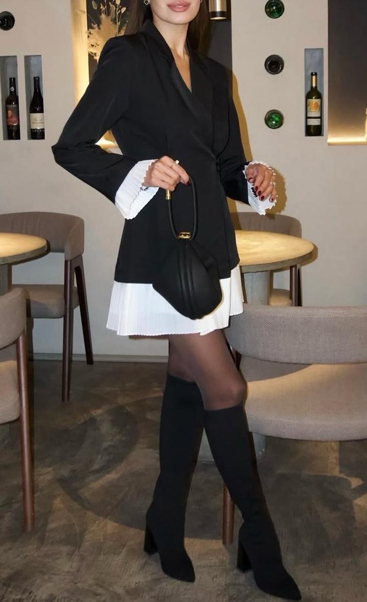 Элегантное платье-пиджак с плиссировкой Продаю очень стильное и необычное платье. Верх выполнен в виде строгого черного жакета, который подчеркивает талию, а по низу и на манжетах — легкая белая плиссировка. Платье смотрится дорого и эффектно. Отлично подойдет как для вечернего выхода, так и для стильного делового образа. Пишите, с радостью отвечу на вопросы и пришлю дополнительные замеры! Артикул: 514316