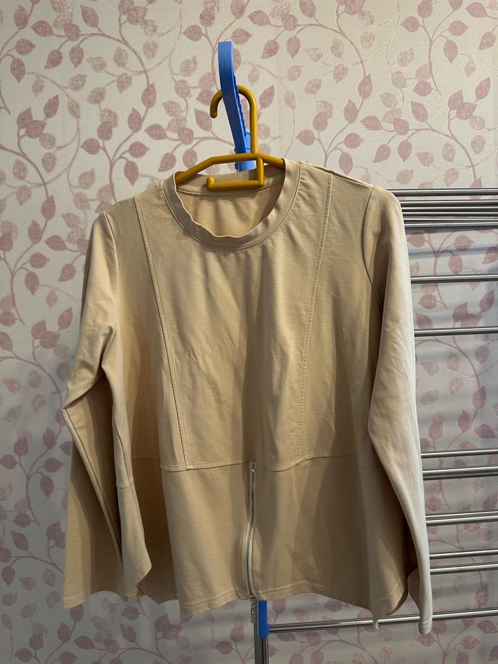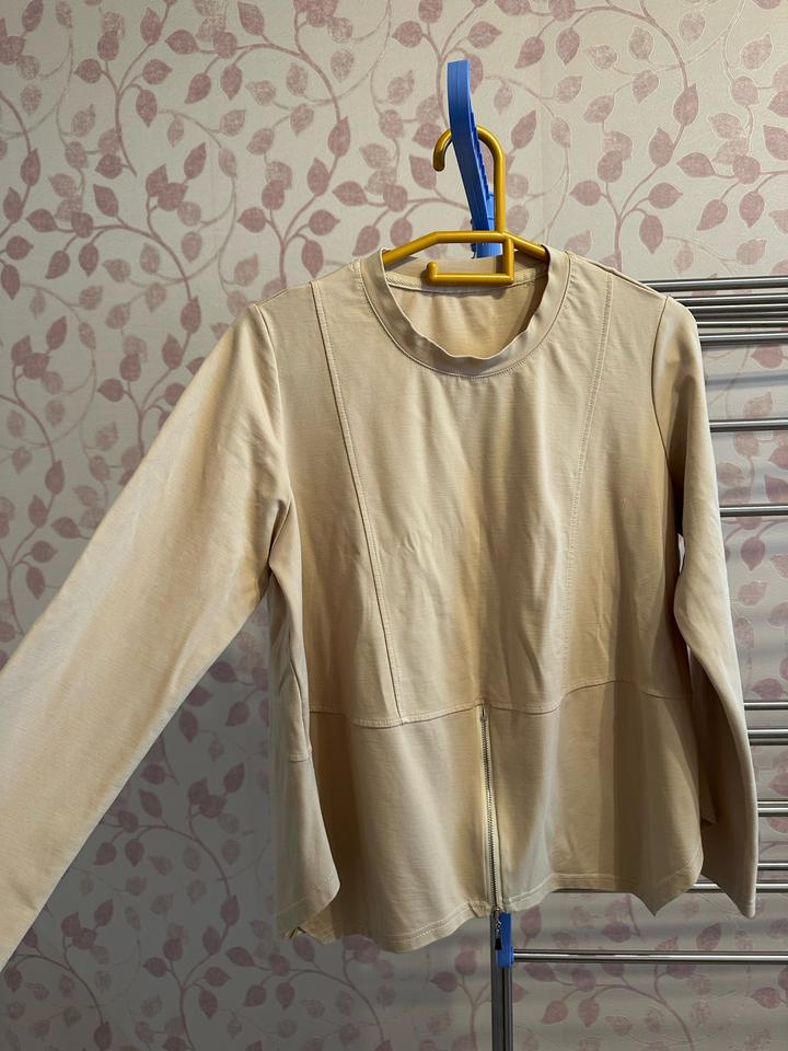 Женская базавая кофта, размер 44-46; свободный, можно беременным. Молочно-бежевого цвета. Брала онлайн, мне не подошел размер. Материал отличный, не скатывается. Артикул: 514324