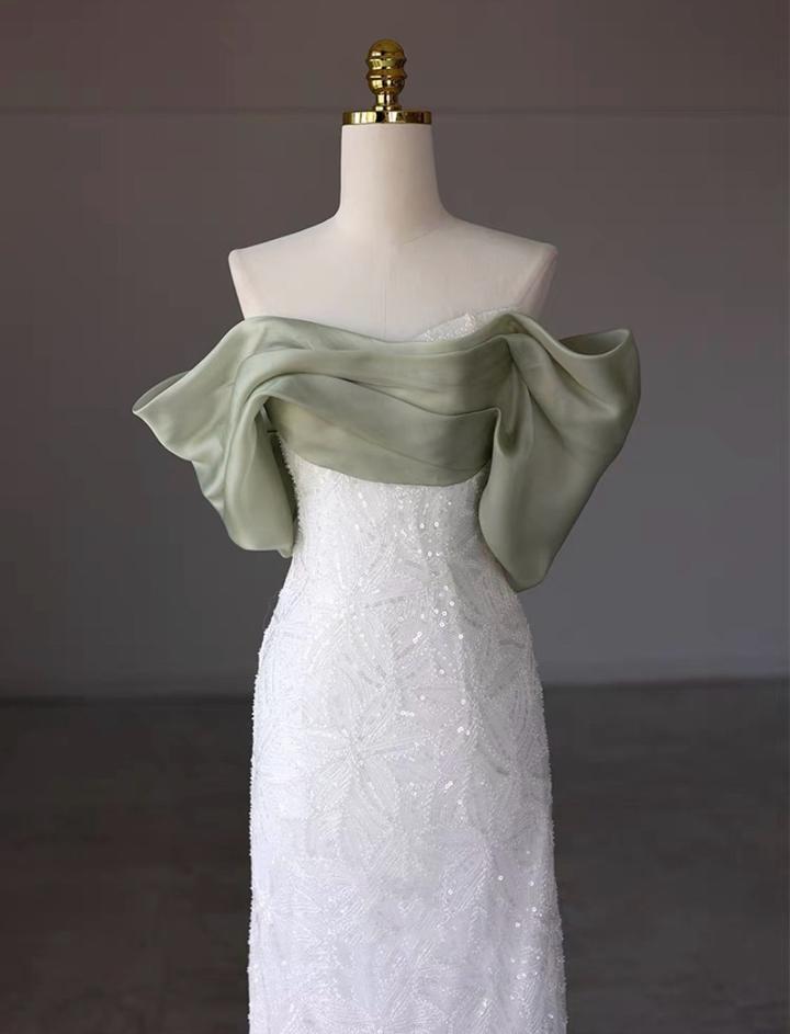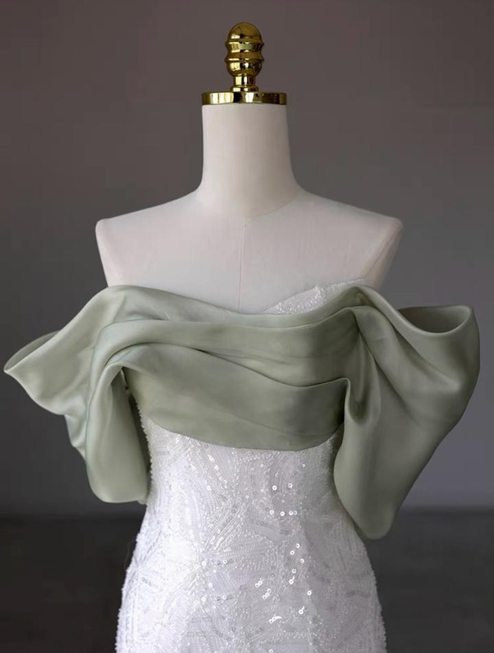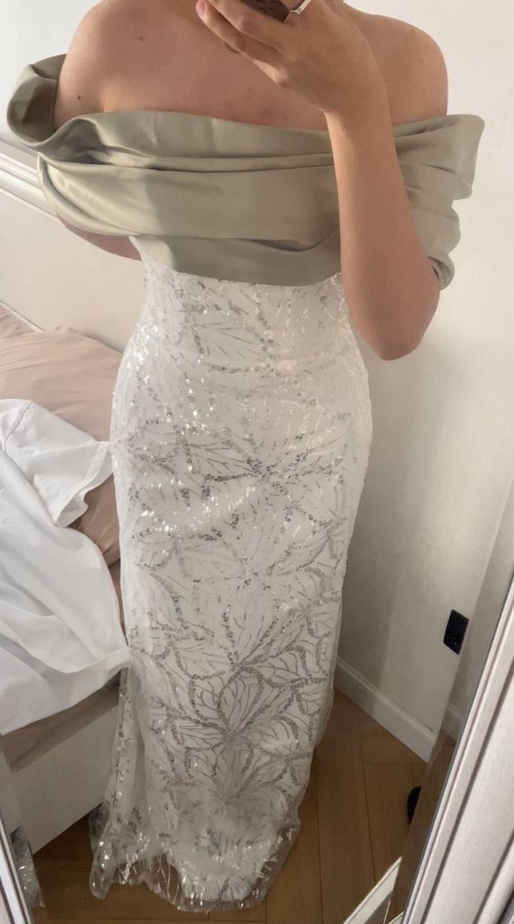 Белое платье с открытыми плечами. Материал: сатин и ткань с пайетками Плечевая часть выполнена из зелёного сатина. Цвет: белый Размер: XL Подойдёт девушке ростом 160+ и примерно 55–60 кг. Надевалось один раз, состояние отличное, без дефектов. Первоначальная цена: 48 000 тг. Артикул: 514442