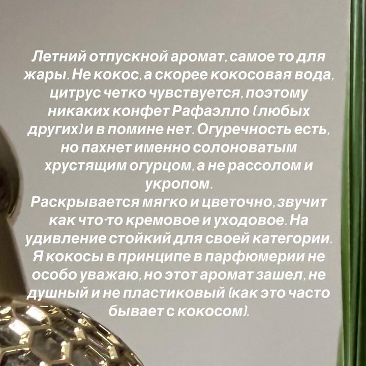 Распив 5 мл. Aqua Allegoria Coconut Fizz Guerlain — это аромат для мужчин и женщин, он принадлежит к группе фужерные фруктовые. Aqua Allegoria Coconut Fizz выпущен в 2019 году. Парфюмер: Delphine Jelk. Верхние ноты: Кокосовый нектар и Бергамот; средние ноты: Водные фрукты и Фрезия; базовые ноты: Сандал и Бобы тонка. Артикул: 514693