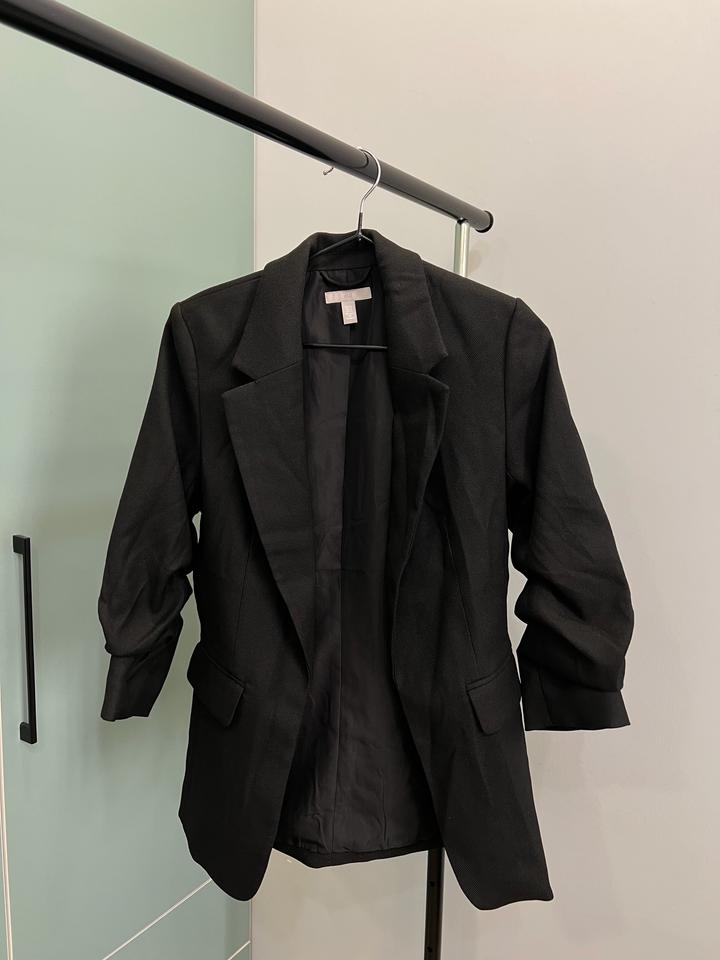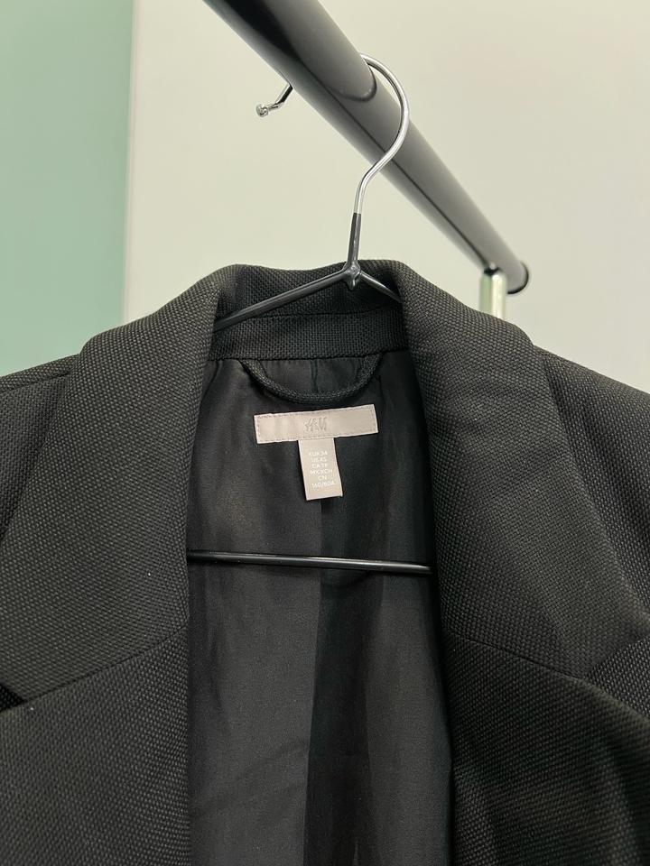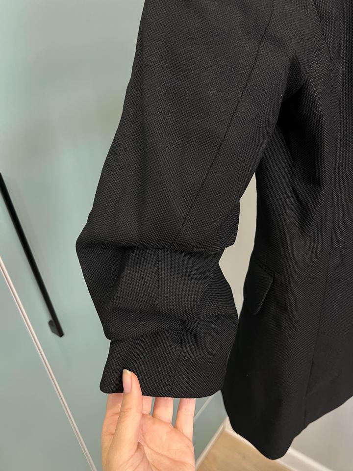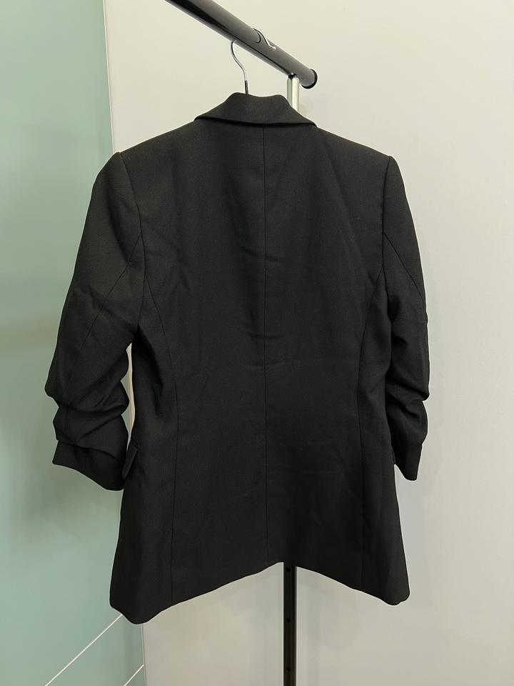 Черный пиджак приталенный, рукава собраны 3/4. 1 раз надела на мероприятие. Состояние отличное. С подкладом. Артикул: 515812