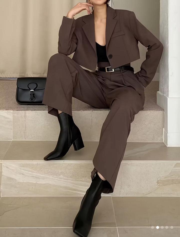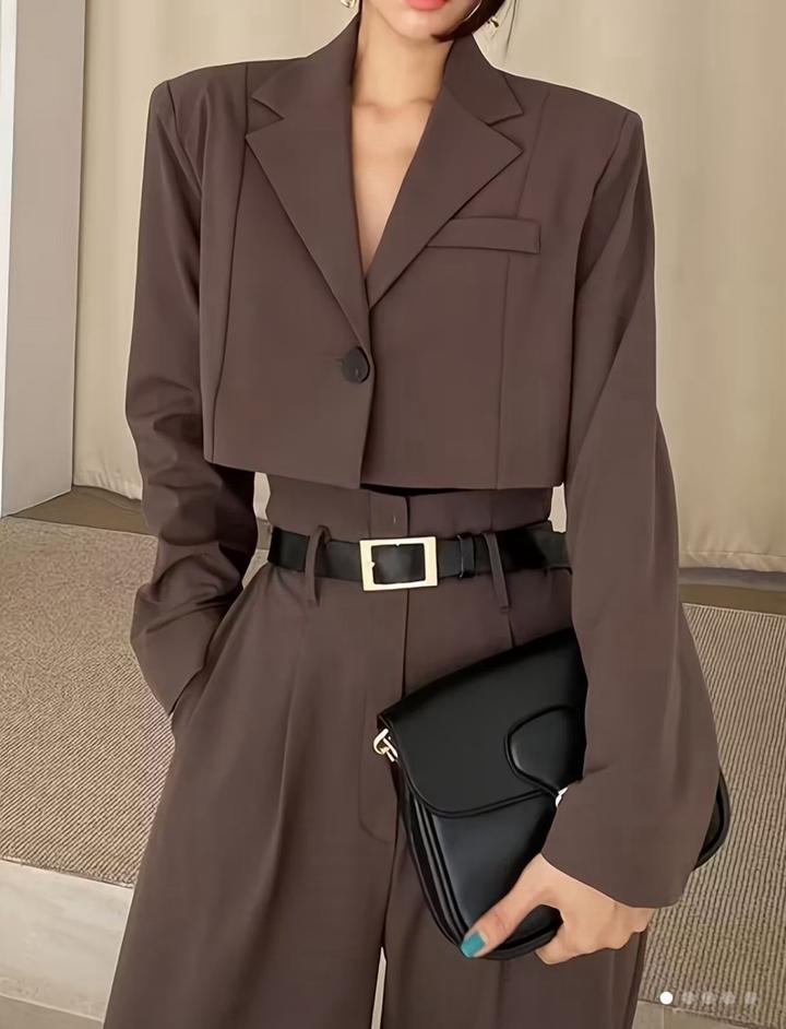 Специально разработанный весенне-осенний новый комплект из 2 предметов: короткий однобортный пиджак в винтажном стиле с лацканами с вырезом и брюки с высокой талией и длинными широкими штанинами Артикул: 515900
