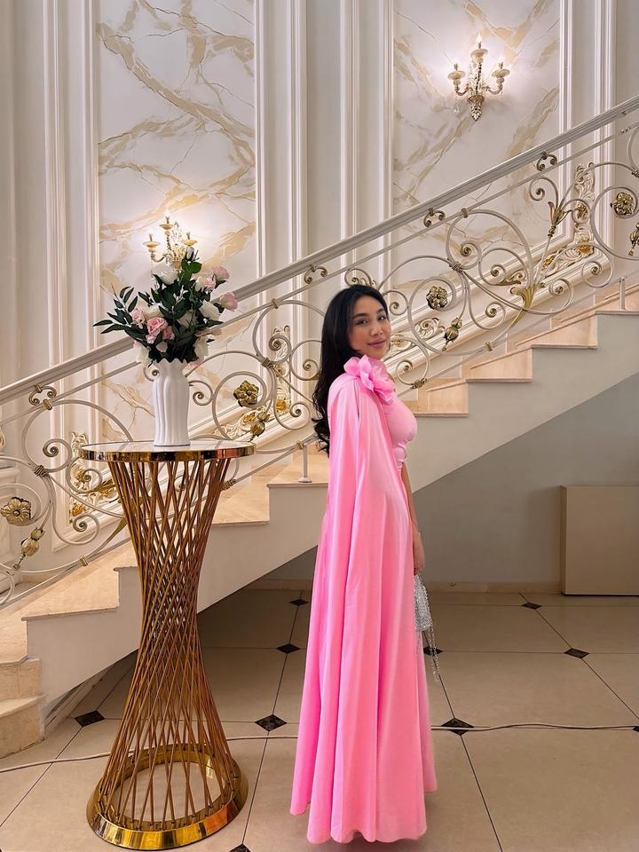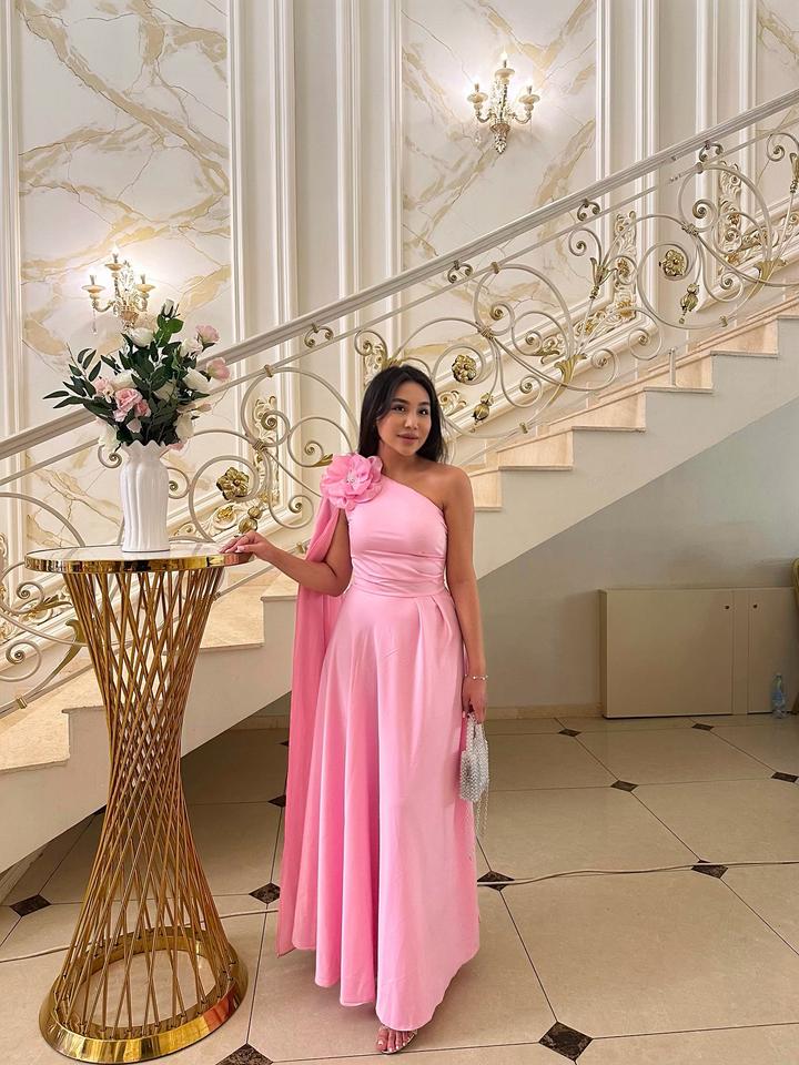Вечернее платье в нежно-розовом цвете. Оригинальный дизайн с открытым одним плечом, второе плечо украшено декоративным цветком. От плеча эффектно спускается длинный шлейф, добавляющий образу утонченности и элегантности. Размер: M (44–46). Сшито на заказ. Надевалось один раз, состояние идеальное. Отличный вариант для мероприятий, фотосессий и торжеств. Артикул: 515943