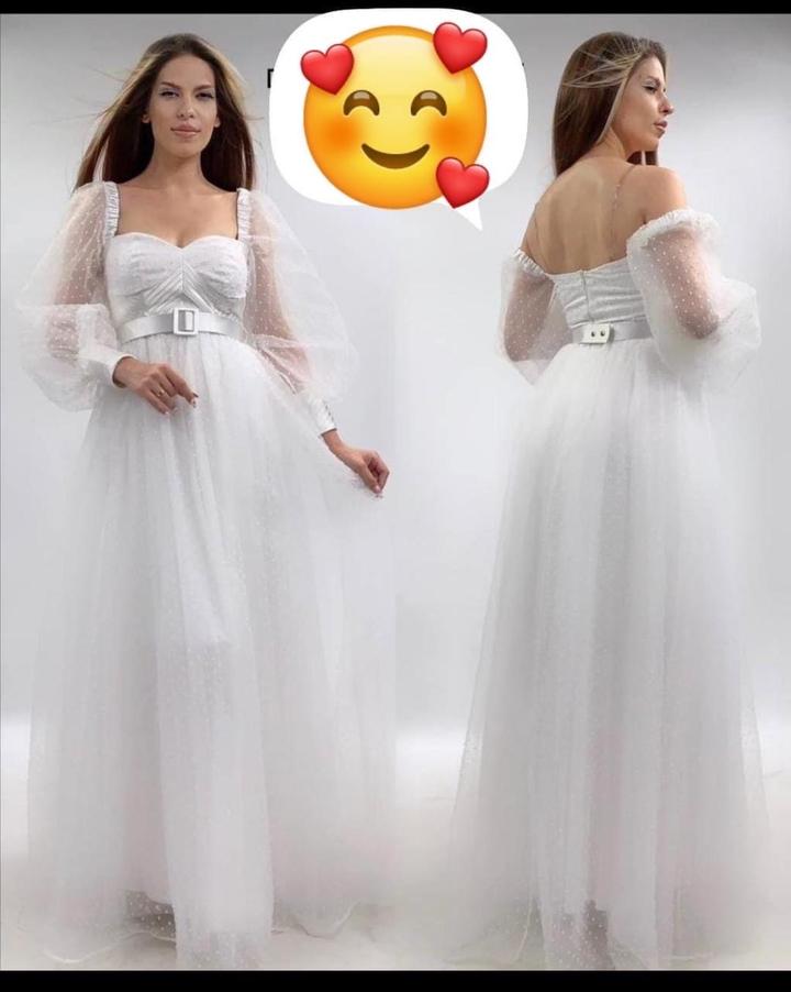 Романтичный, свадебный, «Modern Princess». Воздушное платье макси в цвете «айвори». Выполнено из легкого фатина в мелкий горошек (point d'esprit), что придает образу девичье очарование и легкость. Главная фишка — пышные рукава-буфы и лиф в стиле корсета, который подчеркивает линию груди. Широкий пояс с пряжкой акцентирует талию, создавая идеальный силуэт. Лучший выбор для невесты (второй день или роспись), выпускного или нежной фотосессии. Артикул: 516098