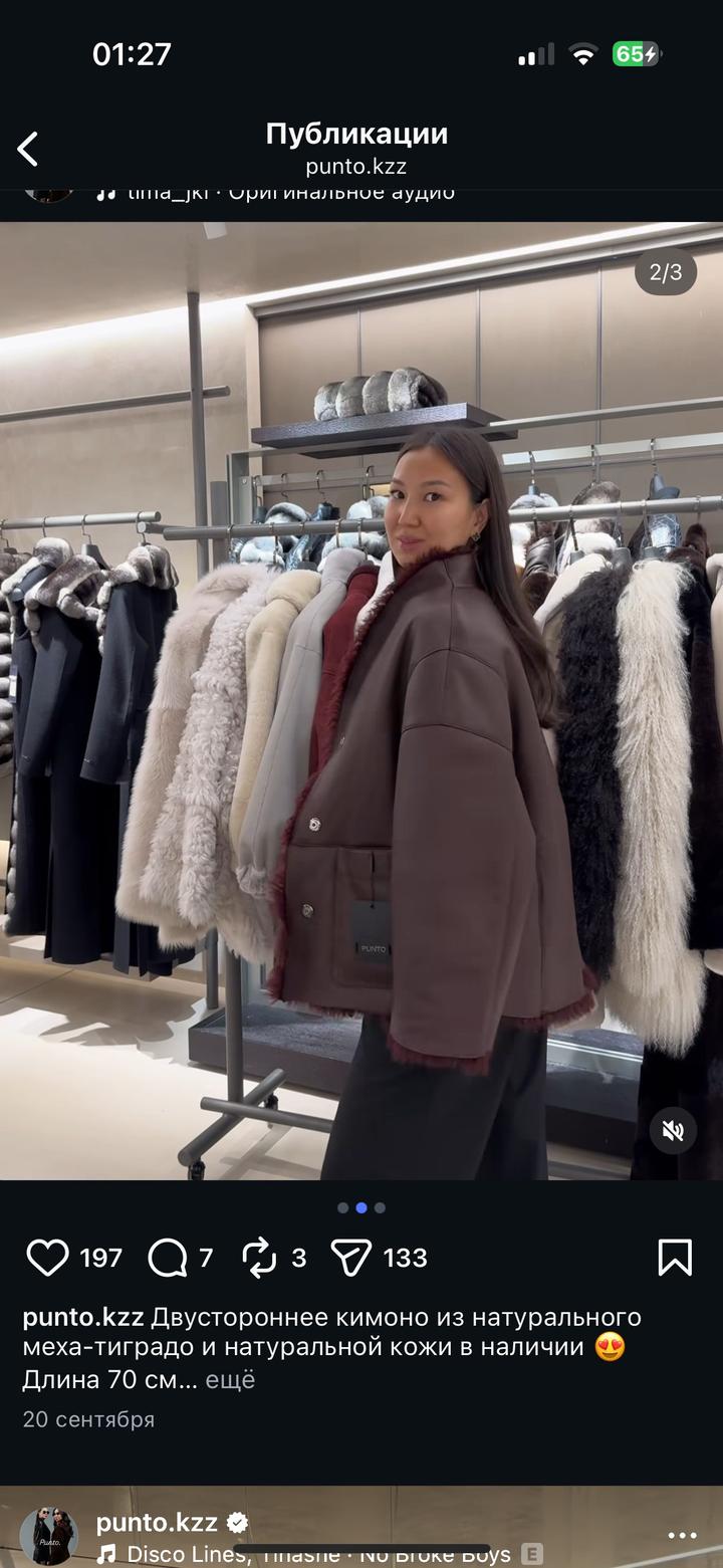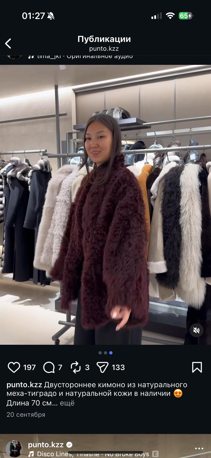 Размер S, но спокойно подойдет и на M — сидит свободно и красиво. Надевала всего 2 раза, состояние отличное, качество просто 🔥 Лучше смотрится на рост от 160 см (на фото модель — 170 см). Фирма Punto. Покупала за 440 000 тг. Артикул: 516139