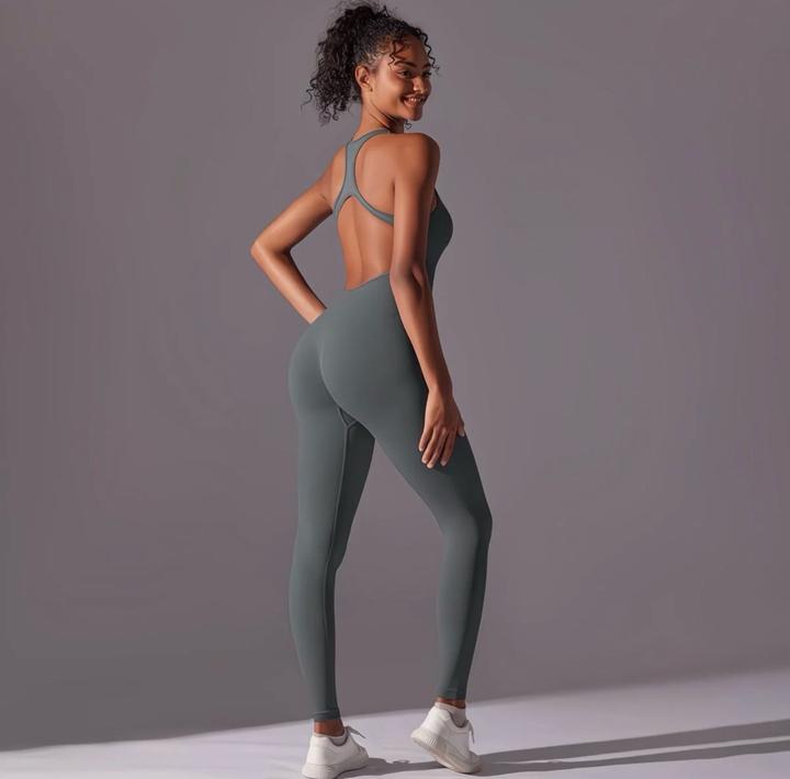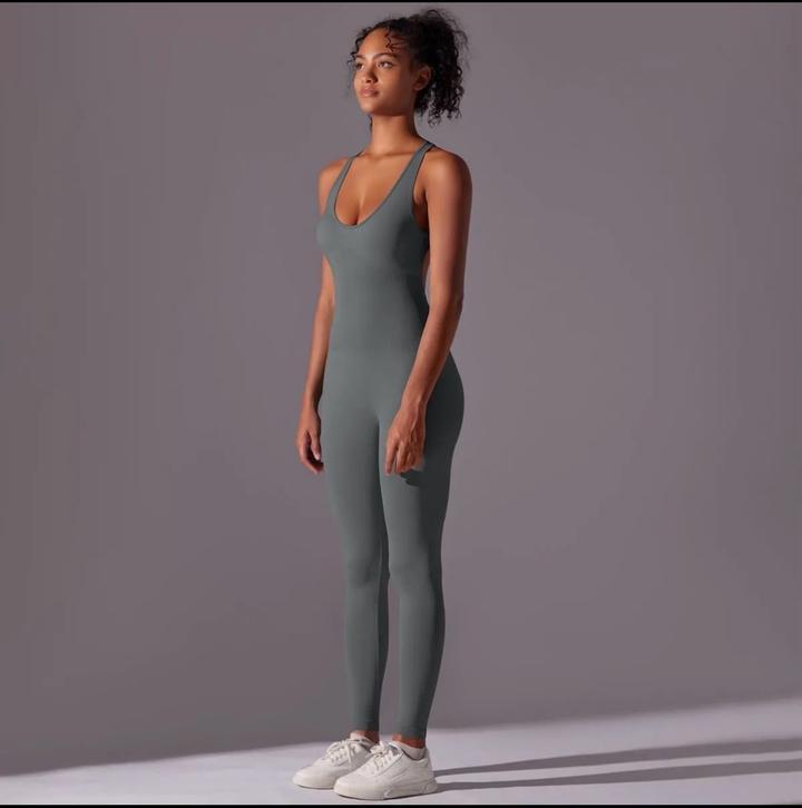 Комбинезон для йоги и фитнеса. В размере 44. Пушап. Сзади красивая спинка открытая. Цвет серый. Артикул: 516605
