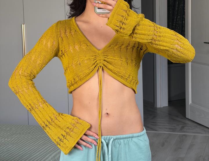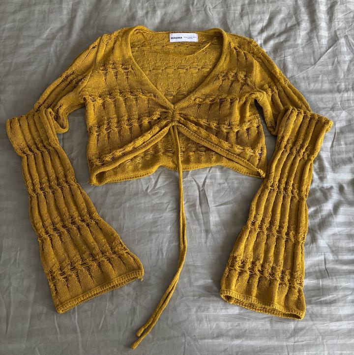 Вязанная кроп кофточка, горчичного цвета. Бренд Bershka, размер XS но он большемерит. Очень хорошее состояние! Артикул: 516887