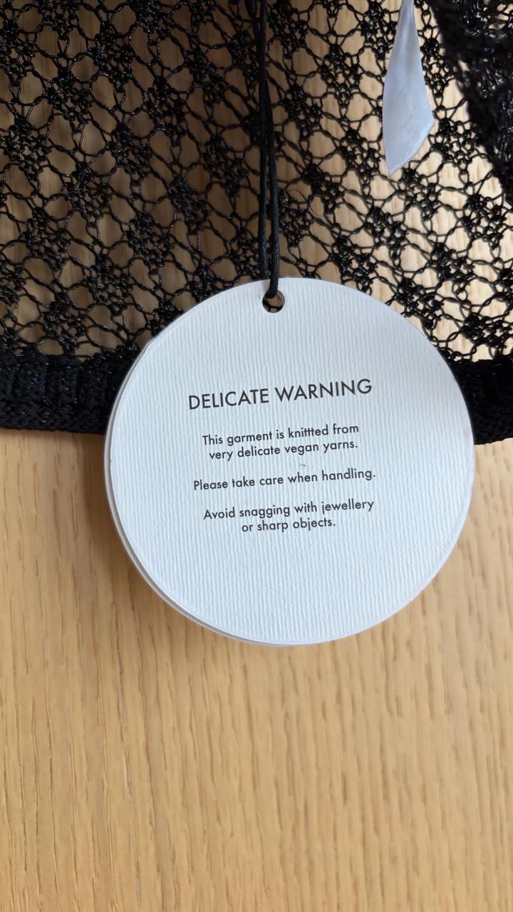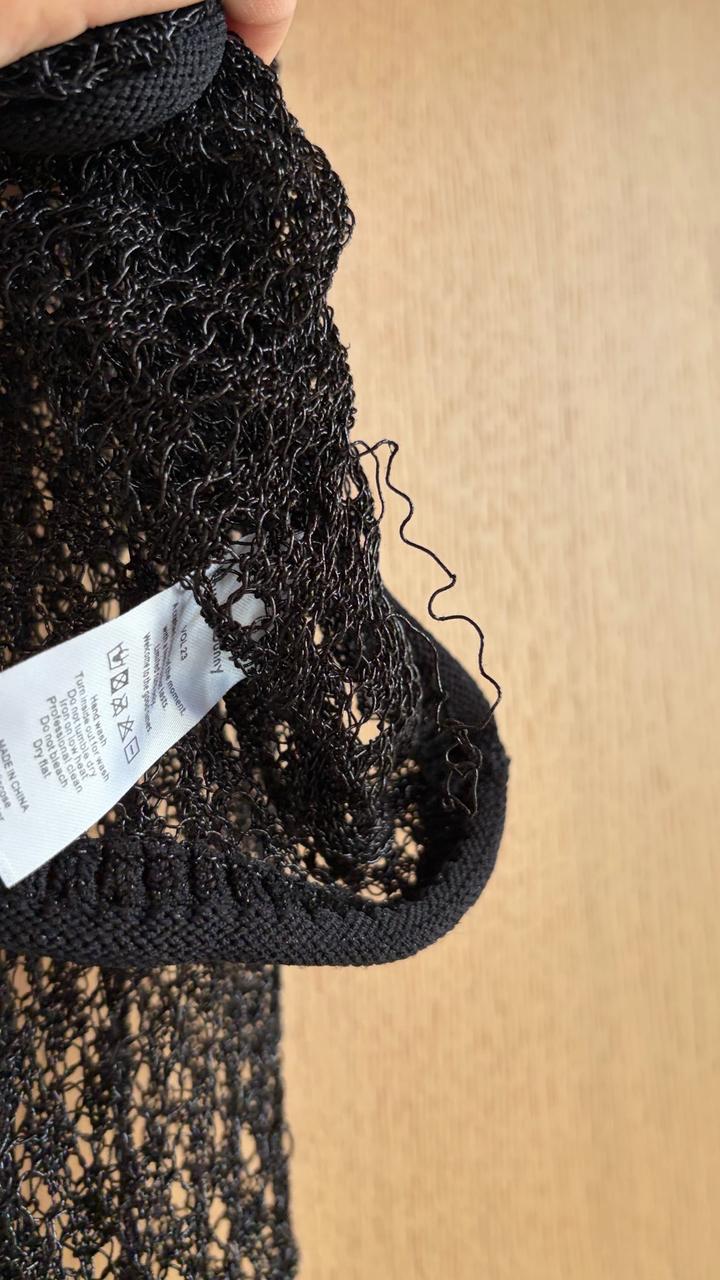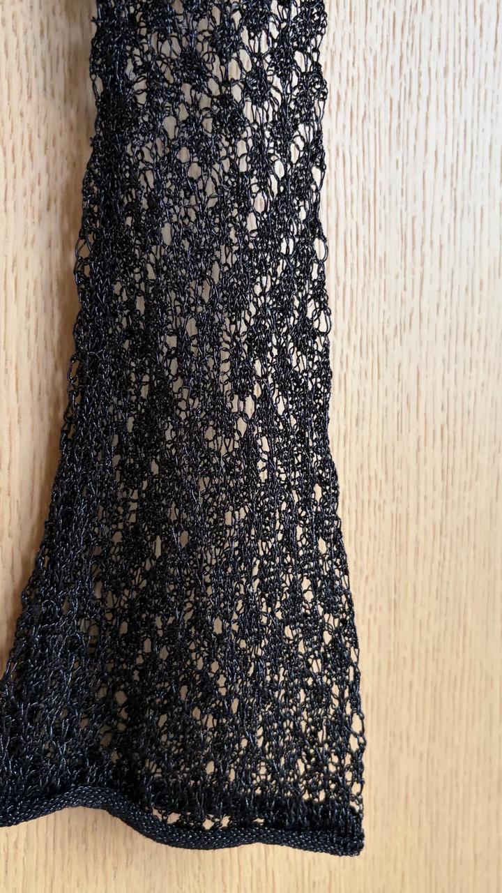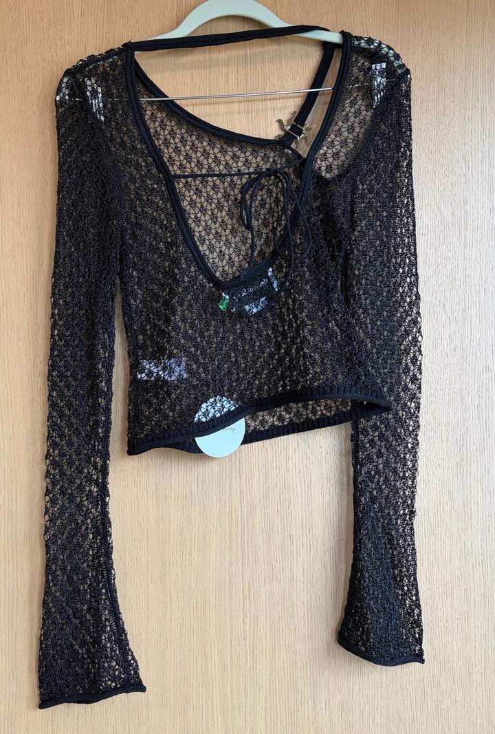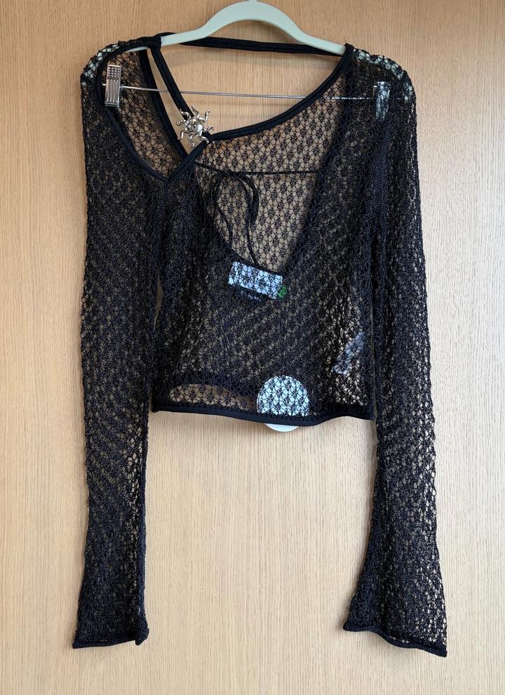 Полупрозрачный ажурный лонгслив из деликатного трикотажа с выразительной текстурой. Акцентная деталь - фирменная металлическая брошь в форме солнца на тонкой бретели. Асимметричный вырез и открытая спинка с завязками добавляют образу чувственности. Длинные рукава с легким клешем. Нюанс: очень деликатная ткань - возможны микро-зацепки грудь 37см (маломерит, на размер S) Артикул: 517343