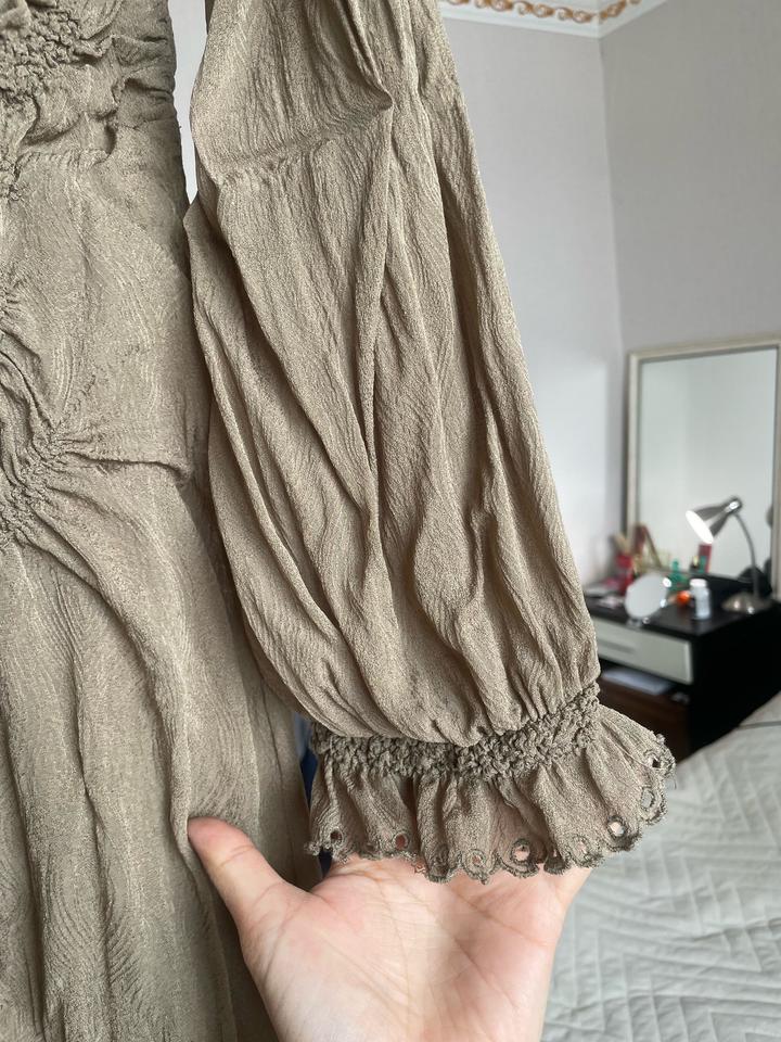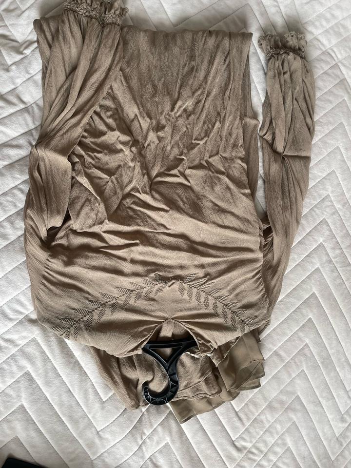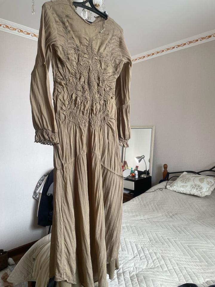 Платье в очень хорошем состоянии, но есть три пятна, может отмоется. Материал тянется, поэтому и подойдет на Л. Цвет хаки. Длинное платье до пяток приросте 168. Есть подклад длинная маечка. Артикул: 517346