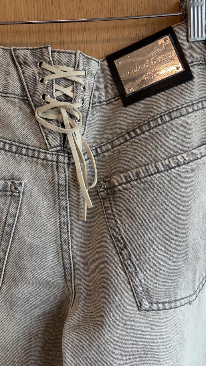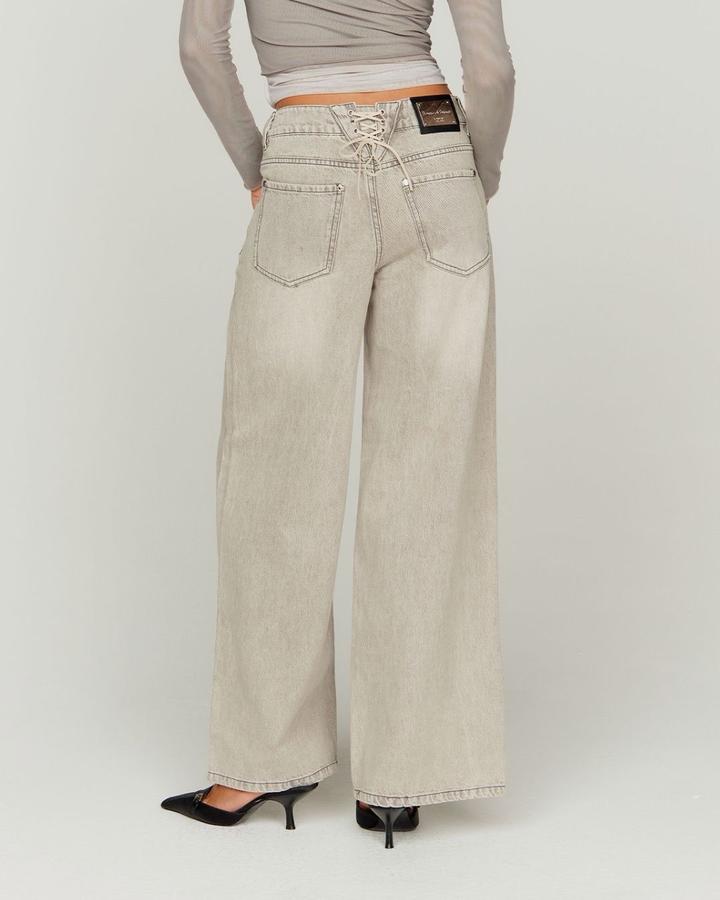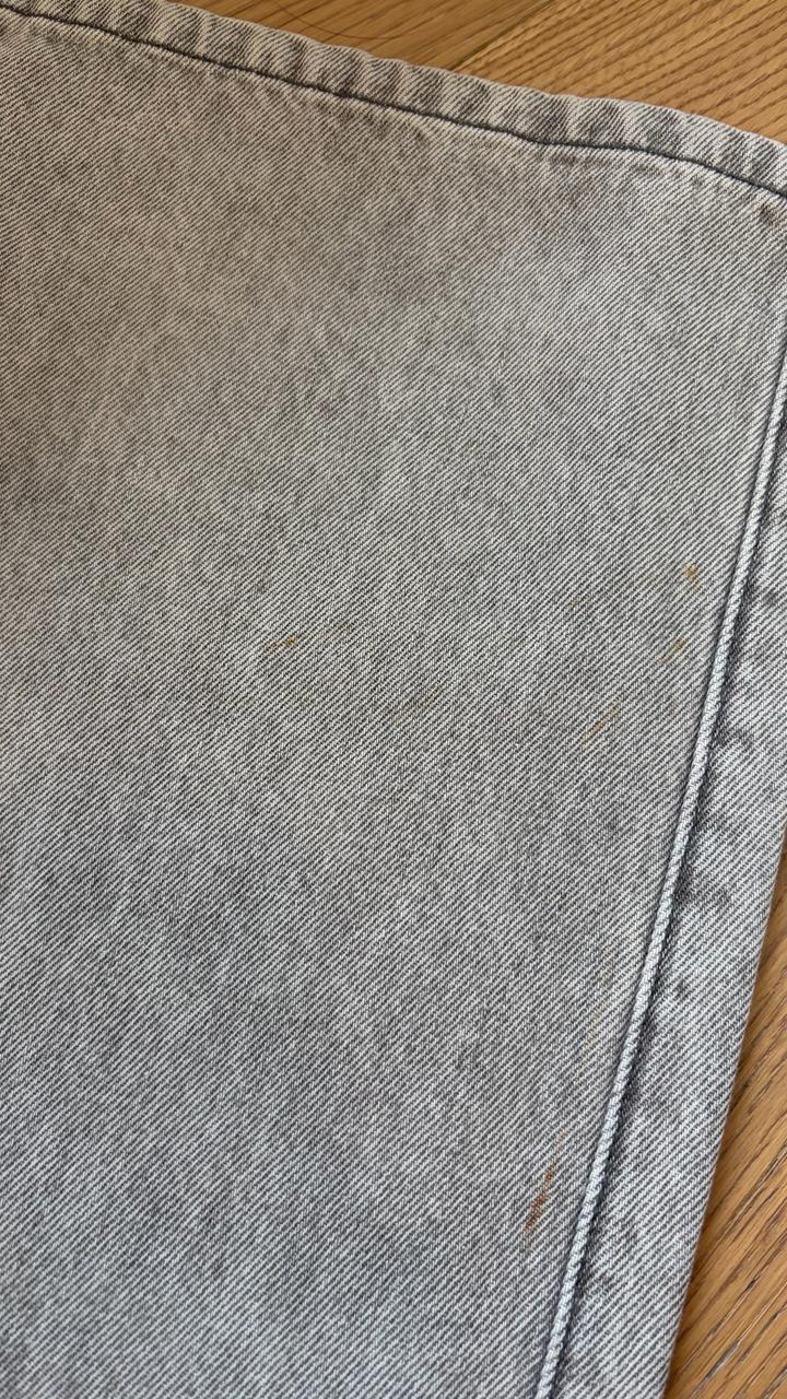 Широкие джинсы с выразительным силуэтом и мягким винтажным вайбом. Светло-серый выстиранный деним Особенности модели: — низкая посадка с акцентом на талии — широкий, почти straight wide-leg силуэт — декоративная шнуровка сзади (регулирует посадку и добавляет характер) — классические карманы + аккуратная металлическая фурнитура Ткань плотная, держит форму и красиво «падает», не создавая лишнего объёма. Есть небольшие пятна на подоле пояс 39 см бедра 46,5 см внут.шов 74 см Артикул: 517385